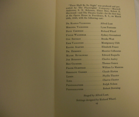 The title comes from a passage in the Book of Revelation (22:5) which is quoted by Lunt's character in Act 3, Scene 6: There shall be no night there: They need no lamp nor light of the sun, for the Lord God gives them light.? The play is set in Finland between 1938 and 1940 and concerns a Nobel Prize-winning Finnish scientist (portrayed by Alfred Lunt, whose own stepfather was a Finnish-born physician) and his American-born wife (portrayed by Lynn Fontanne), both of whom are reluctant to believe that the Russians will invade their beloved Finland. But with the final advent of Finland's Winter War with the Soviets, their son Erik joins the Finnish army, and the scientist joins its medical corps. John Mason Brown wrote “No one can complain about the theatre's being an escapist institution when it conducts a class in current events at once as touching, intelligent and compassionate as There Shall Be No Night.”