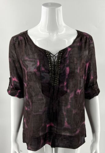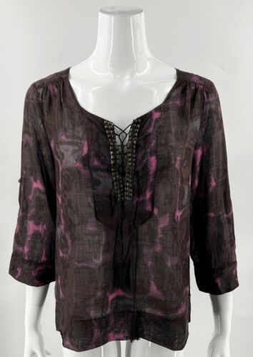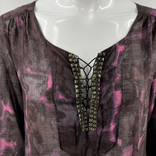 J Crew Factory Top Sz 6 Purple Tie Dye Boho Studded Tie Neck Peasant Blouse