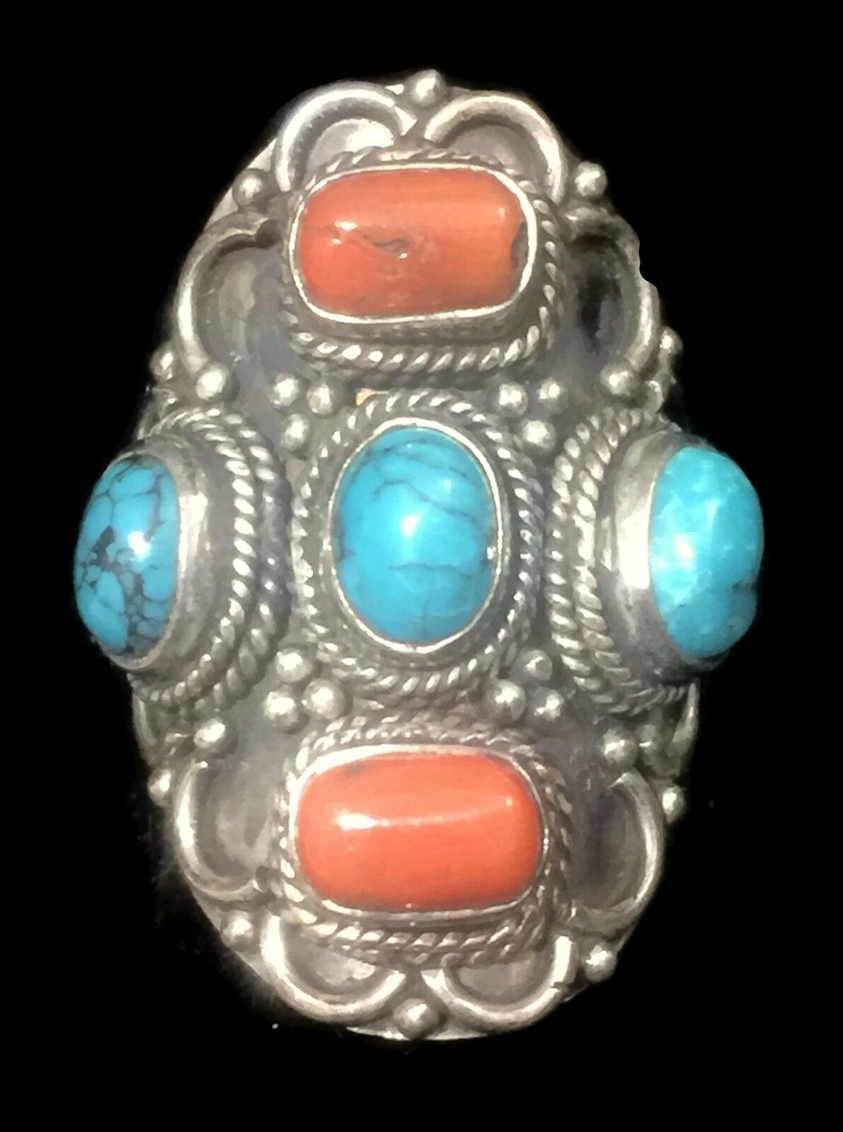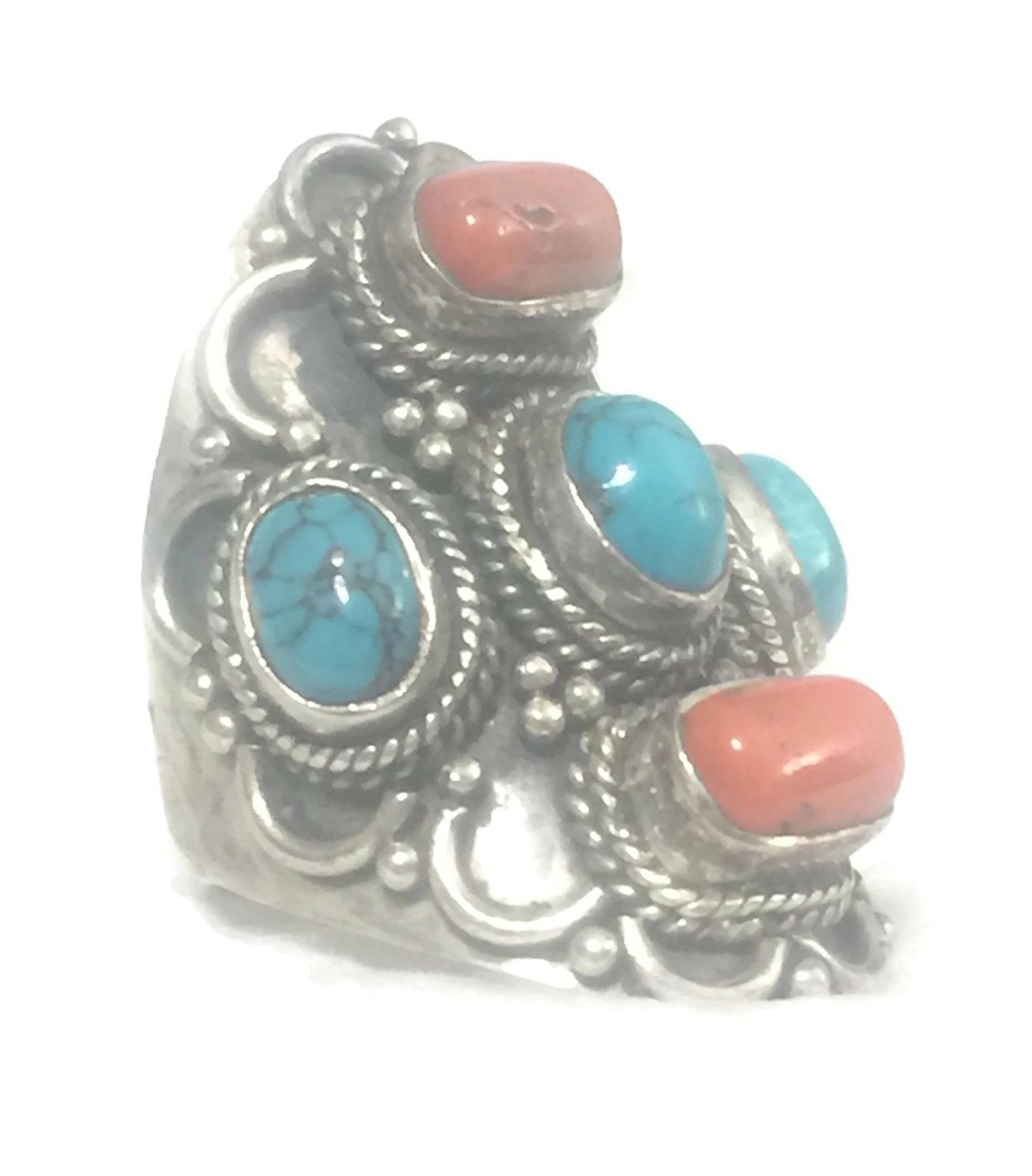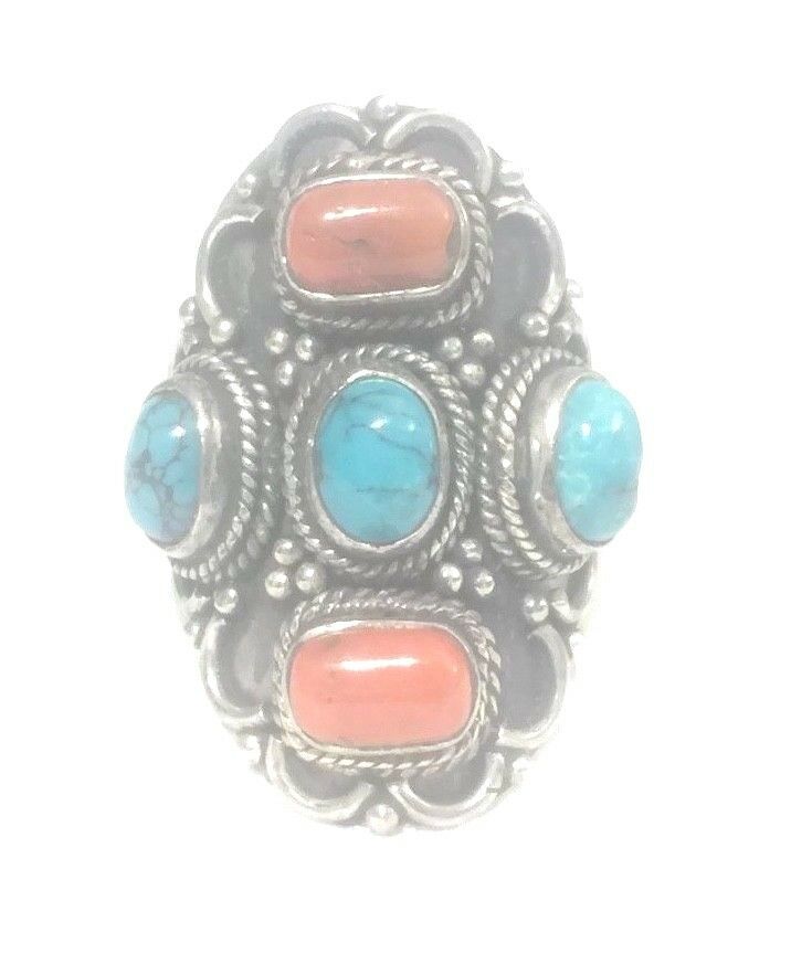 Long Turquoise Coral Ring Vintage Tribal Boho Sterling Silver Size 7.75