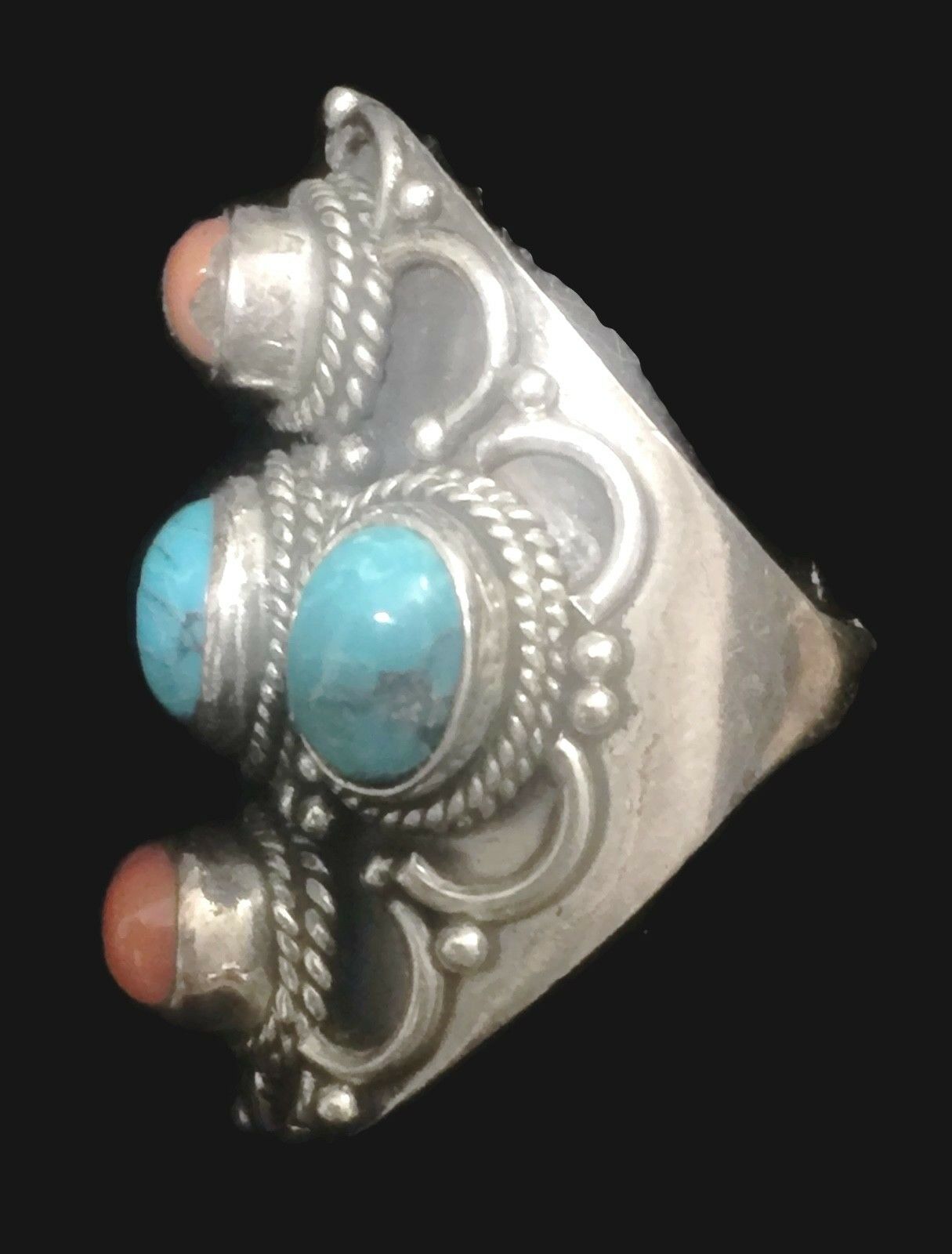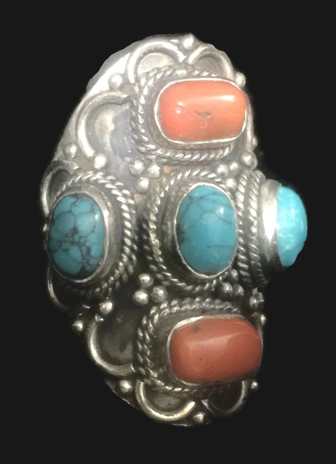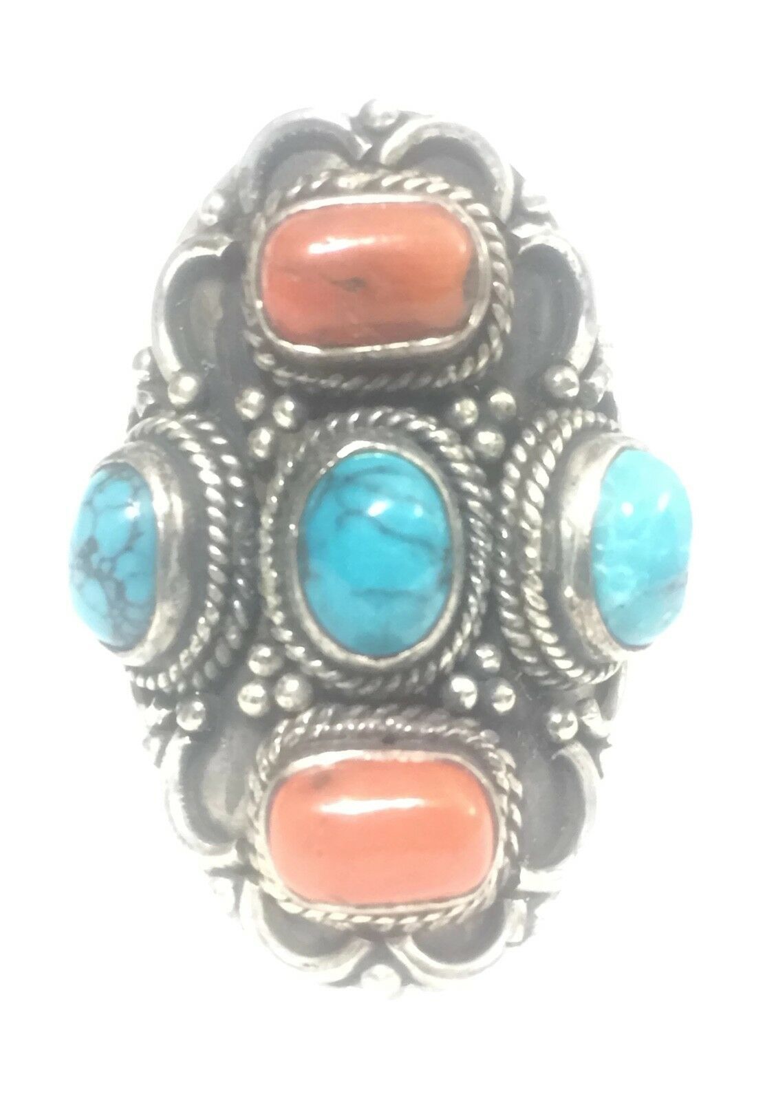 Long Turquoise Coral Ring Vintage Tribal Boho Sterling Silver Size 7.75