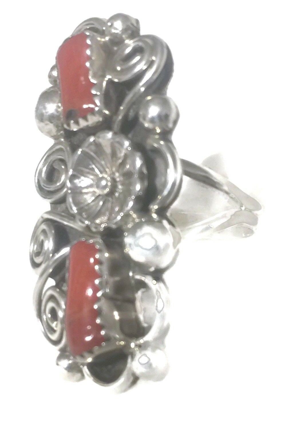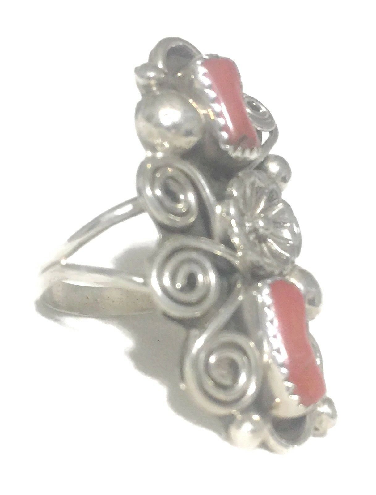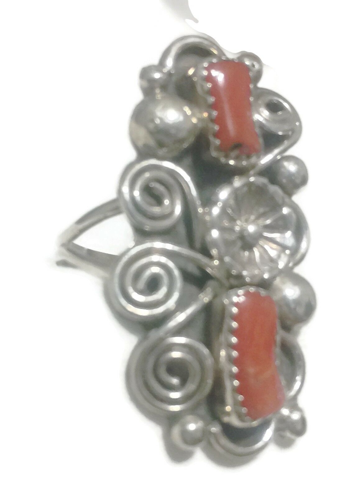 Vintage Navajo Native American Long Coral Sterling Silver Tribal Ring Size 9.50