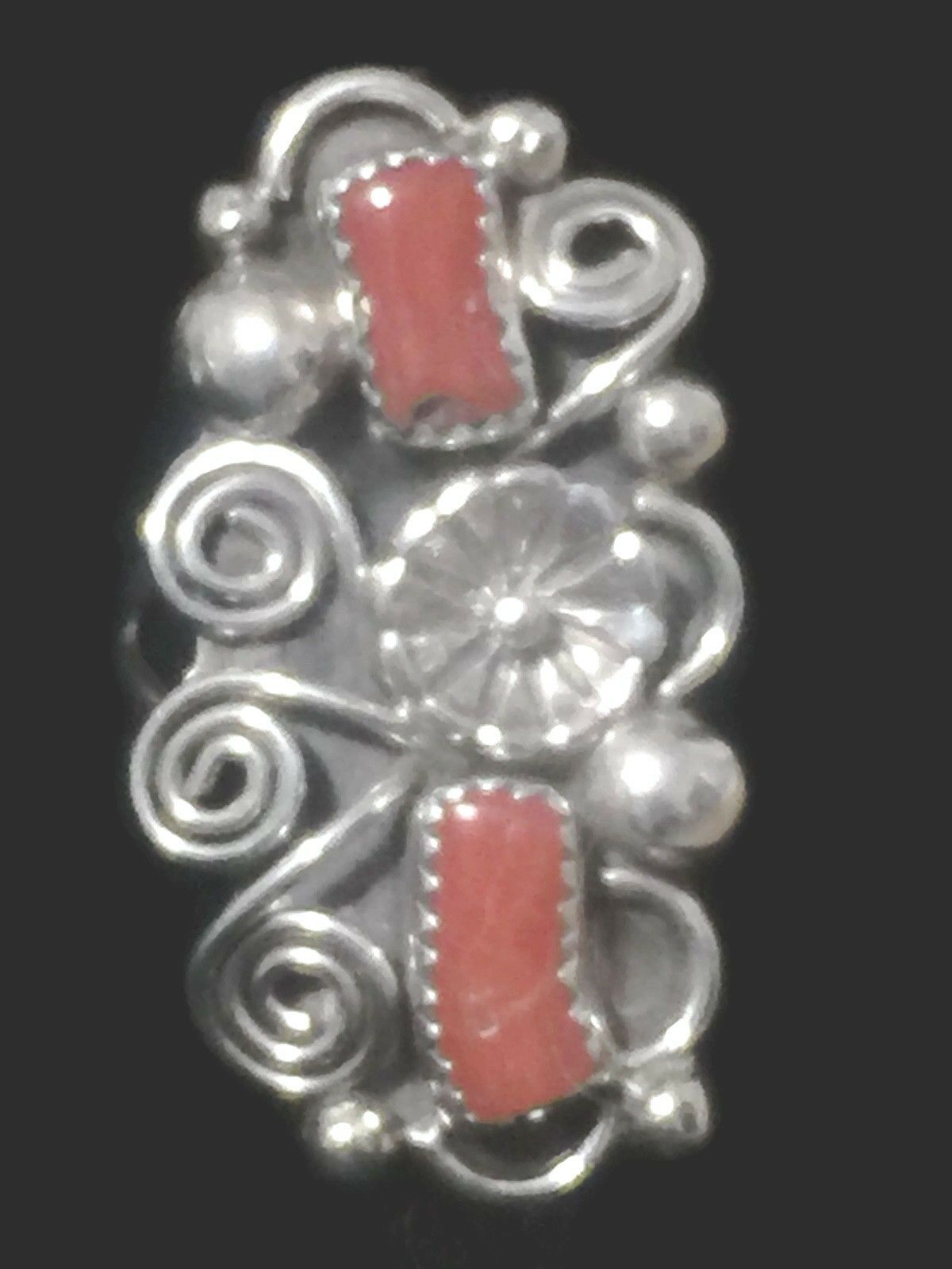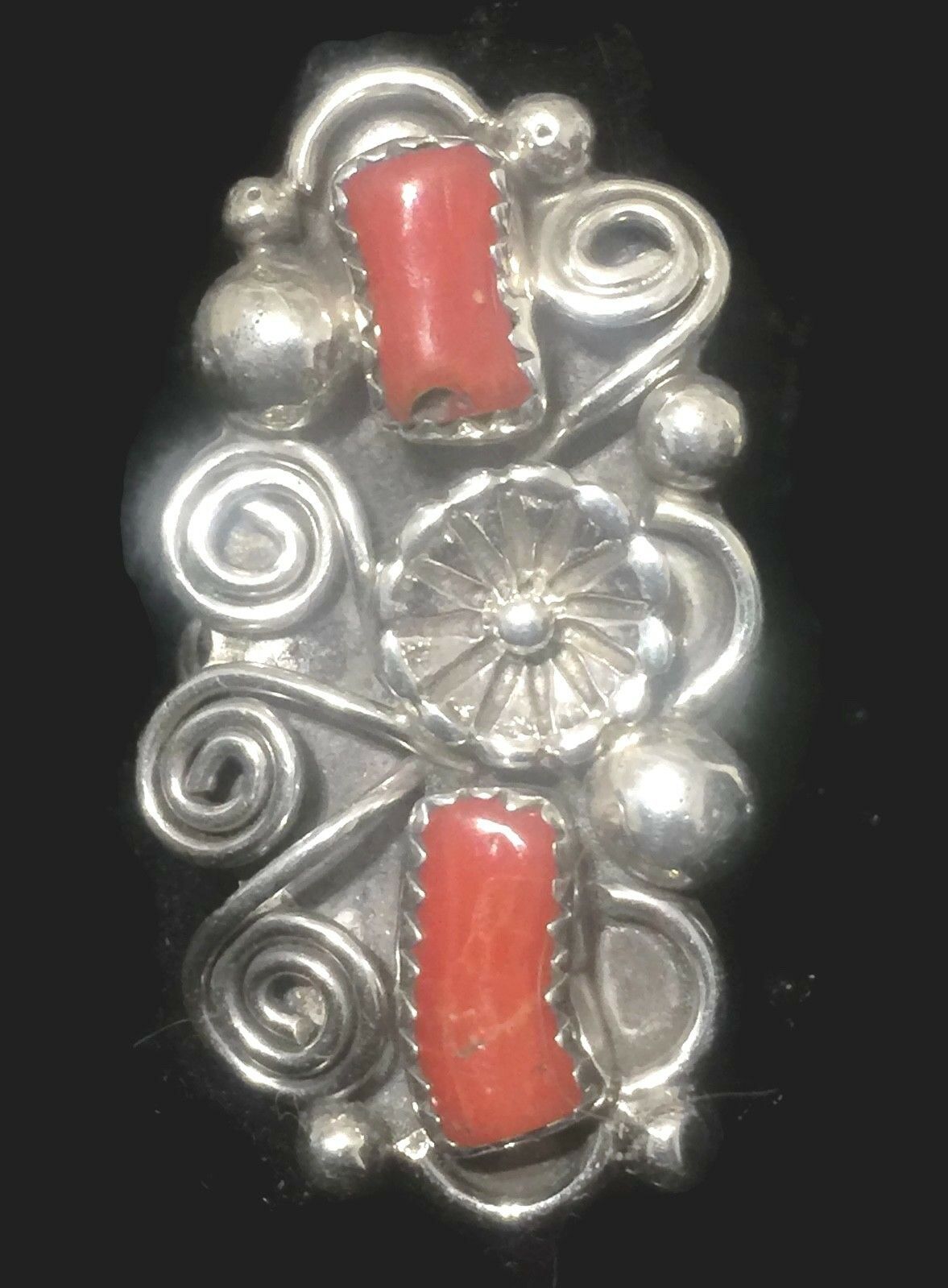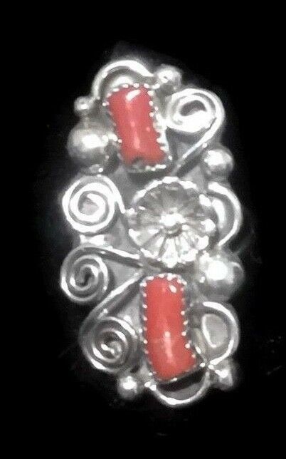 Vintage Navajo Native American Long Coral Sterling Silver Tribal Ring Size 9.50