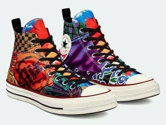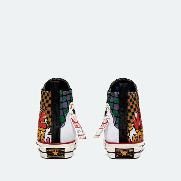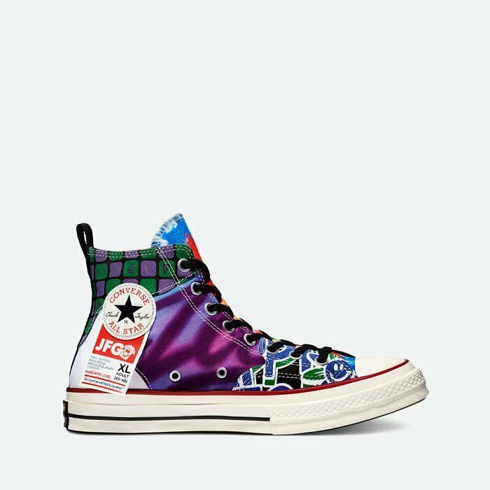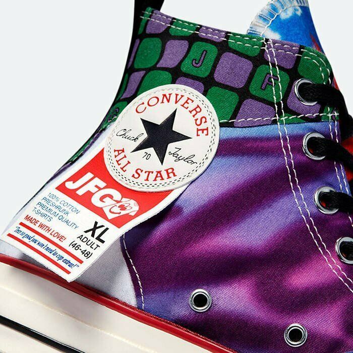 FROM CHICAGO TO THE WORLD. This isn?t Joe Freshgoods? first pair of Chucks. He?s been reworking the iconic canvas for years on the streets of Chicago with his own bootleg designs. Now he?s ready to bring that story global. On this vibrant Chuck 70, Freshgoods goes back to where he got his start: creating graphic tees. Using t-shirt-like jersey material, Joe stitches together his history with a patchwork collage of designs from different eras. Vibrant tie dye, bold lettering and airbrushed graphics converge and showcase the eclectic style mix he?s brought to his work. It?s a story of his past?and a statement of how far he?s come.
