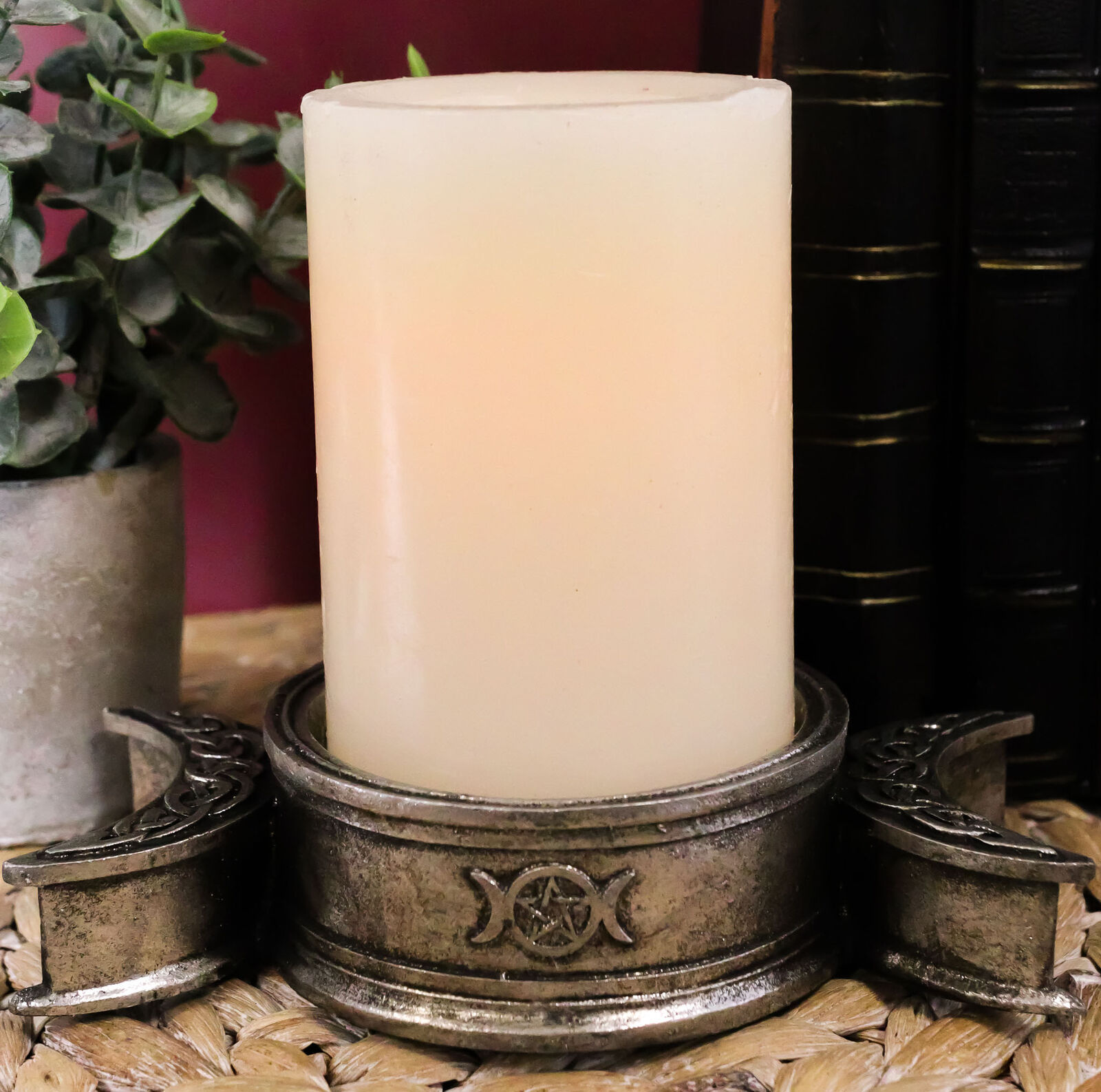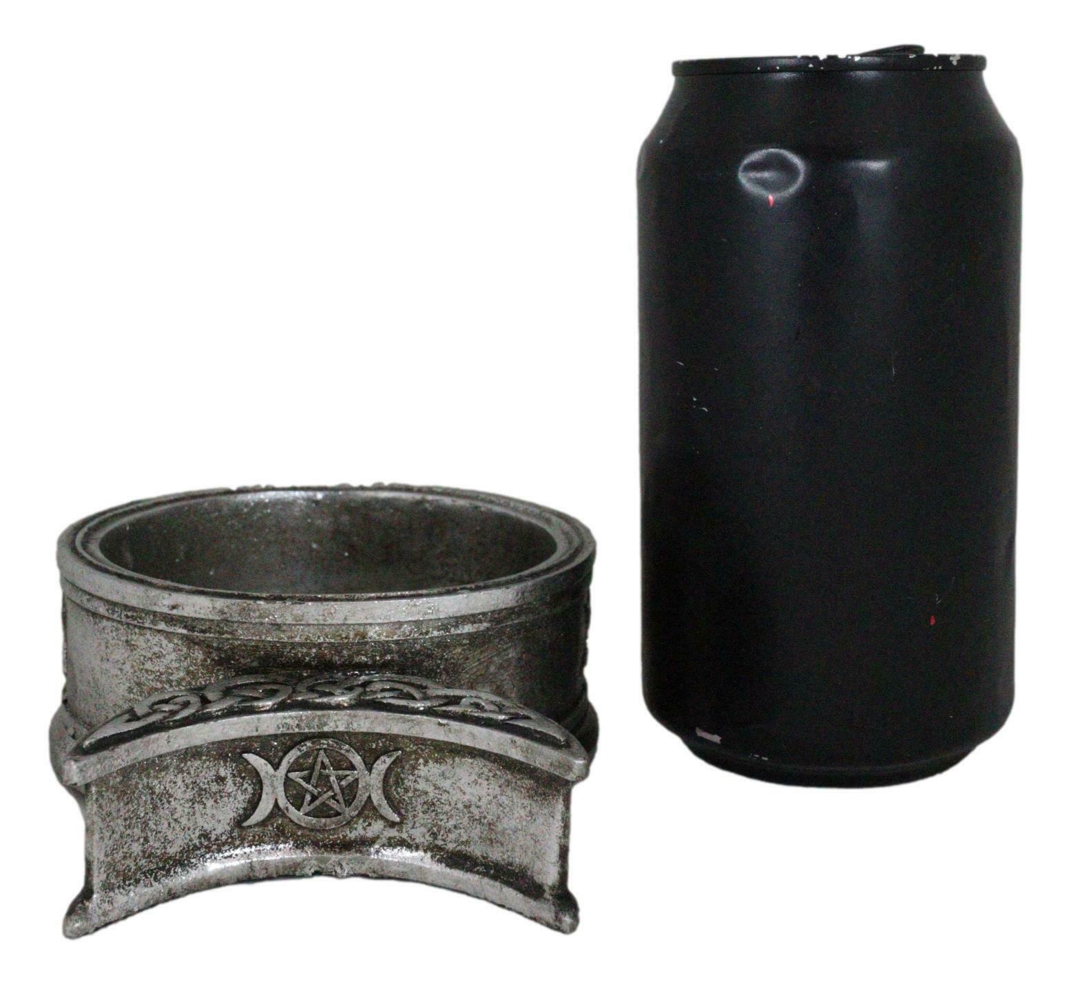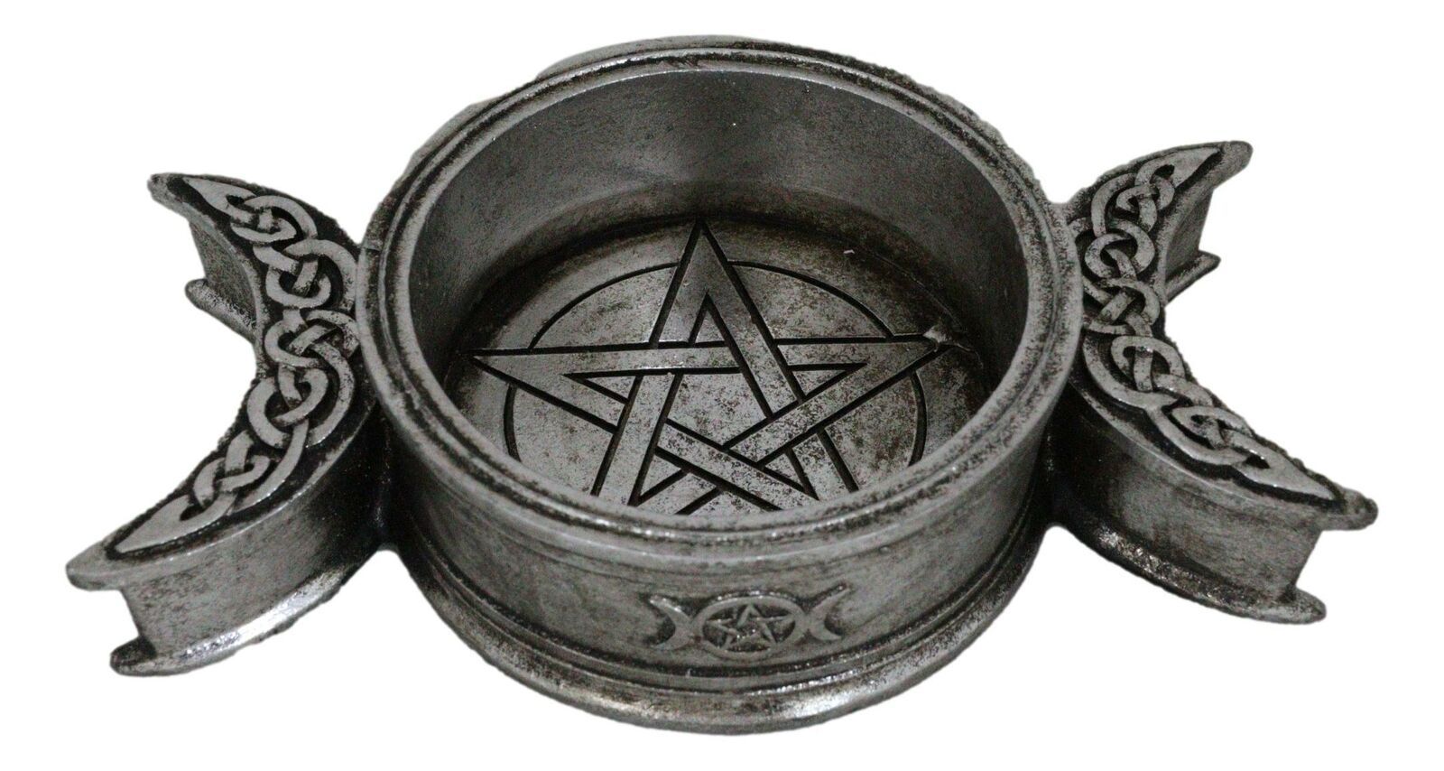 โข Whether you are looking for a candle holder for your altar or just to collect, check out the Triple Goddess Tealight Candle Holder. It is also suitable for displaying crystals, holding jewelry and more. In the center, it has a 3.5" diameter hole to insert a pillar candle and such. This hole is etched with a pentagram star circle to add a decorative value just in case you do not wish to hold anything in it.