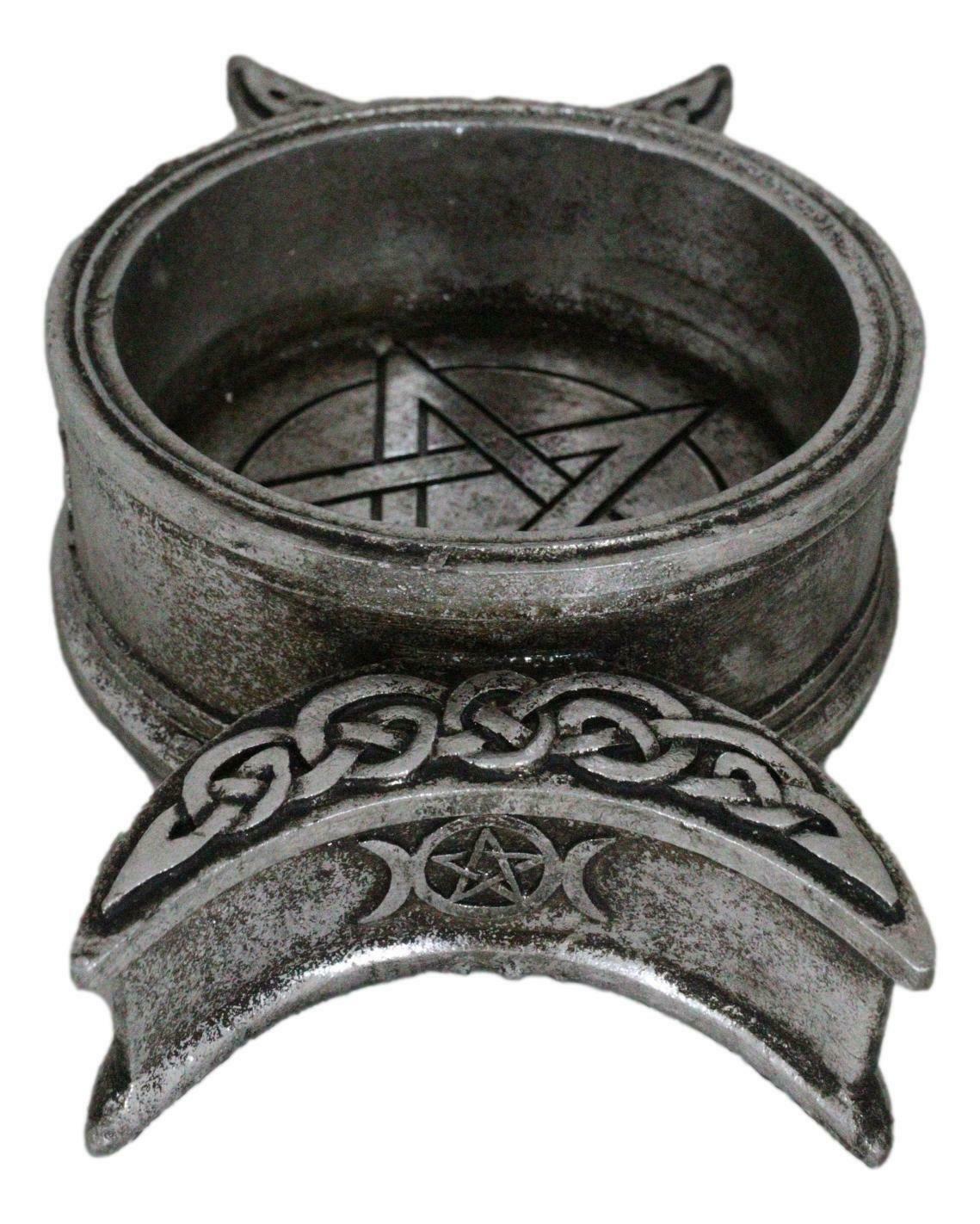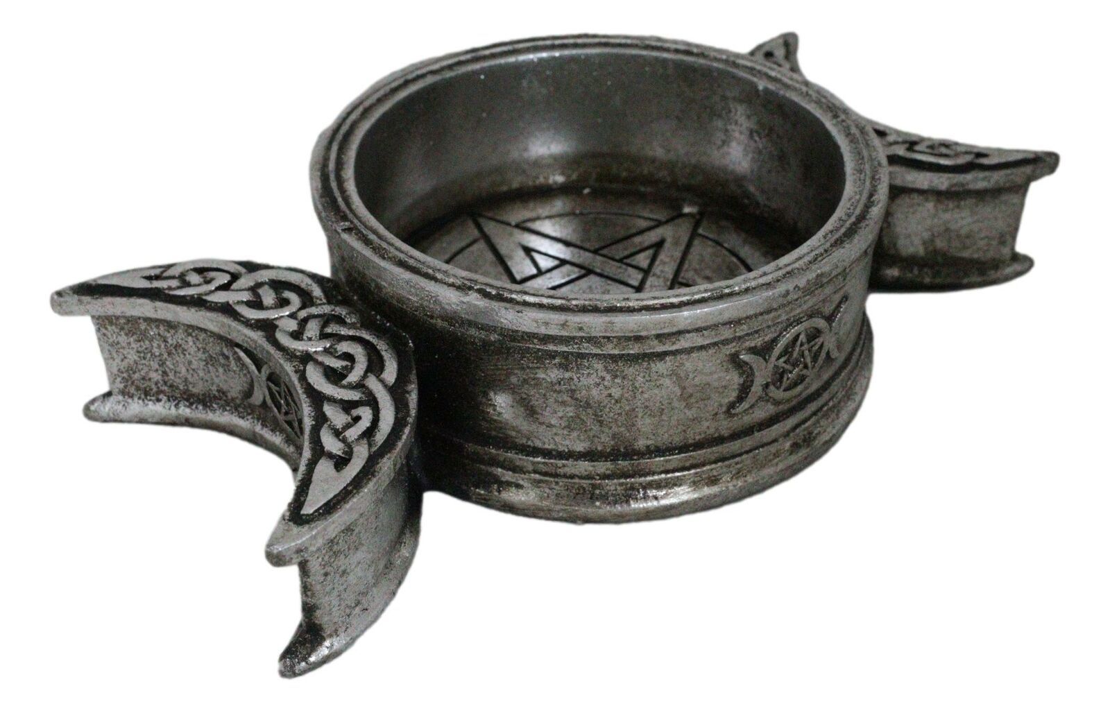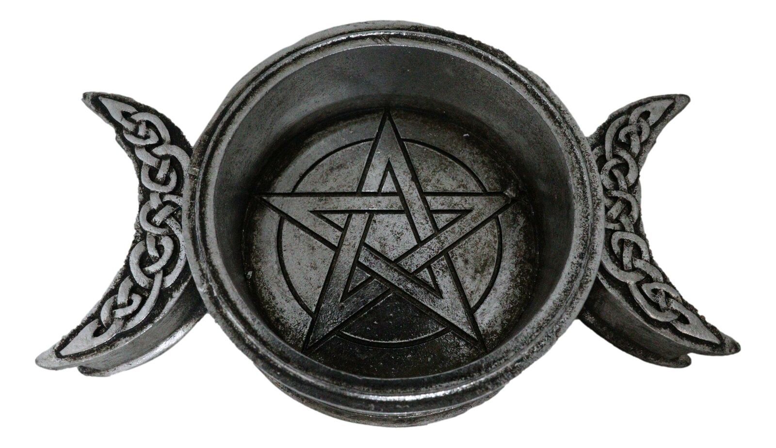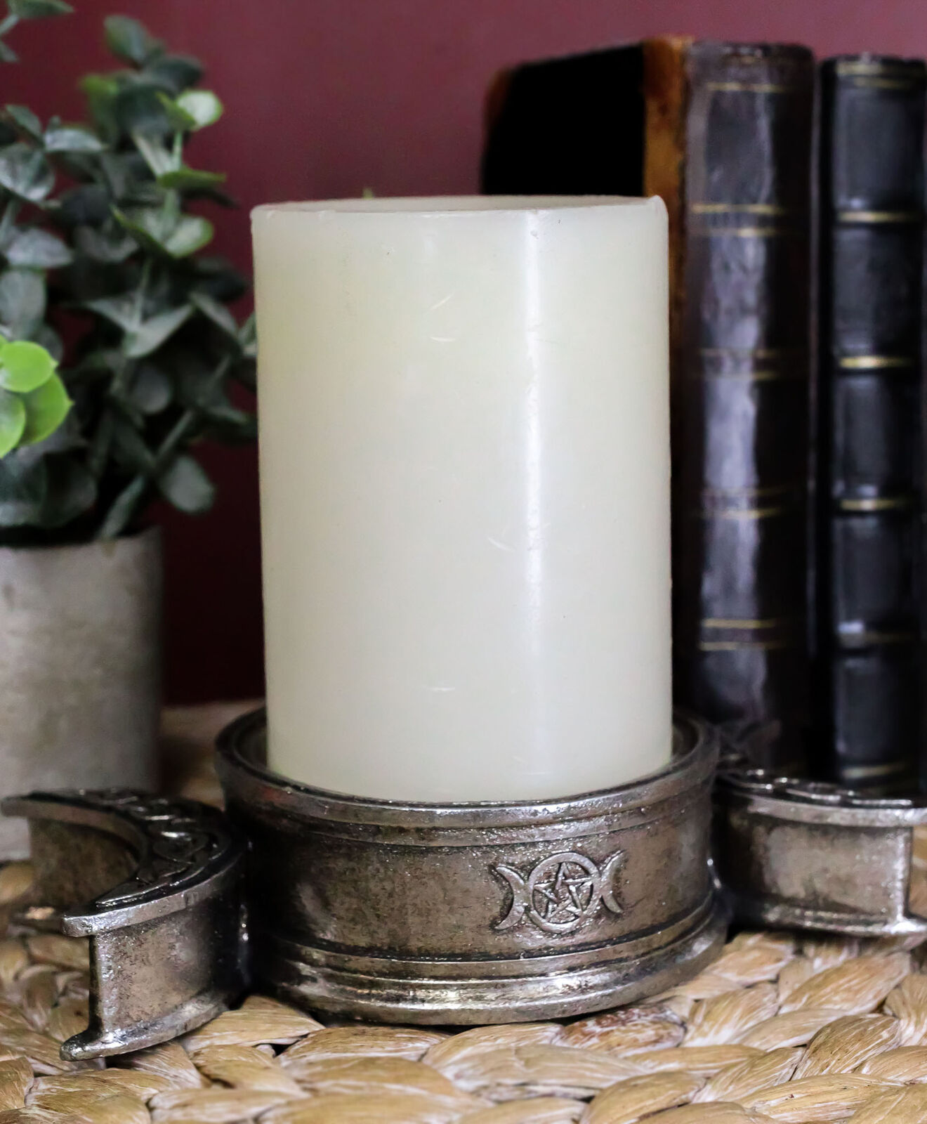 โข Whether you are looking for a candle holder for your altar or just to collect, check out the Triple Goddess Tealight Candle Holder. It is also suitable for displaying crystals, holding jewelry and more. In the center, it has a 3.5" diameter hole to insert a pillar candle and such. This hole is etched with a pentagram star circle to add a decorative value just in case you do not wish to hold anything in it.