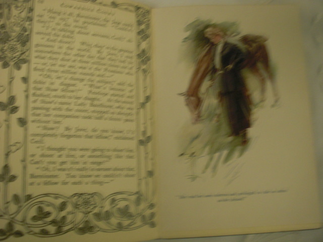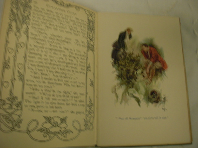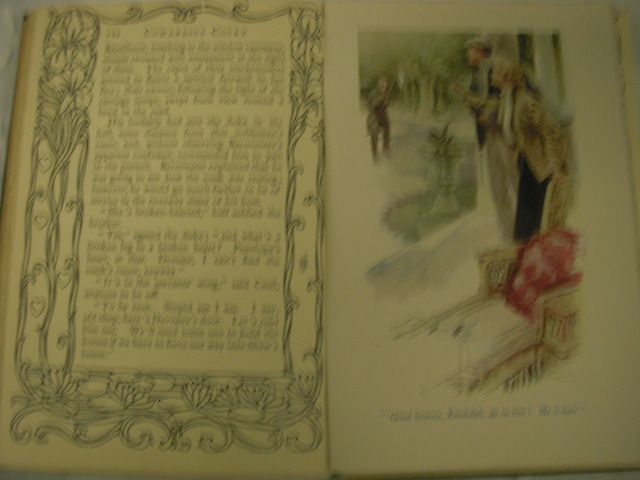 1st edition/1st printing. Printed on very heavy paper stock with lavish Black decorations on borders of each page. 5 full page color Harrison Fisher illustrations--lovely! Bound in green cloth with white decorations and printing, and oval color plate on binding front. Previous owner's name