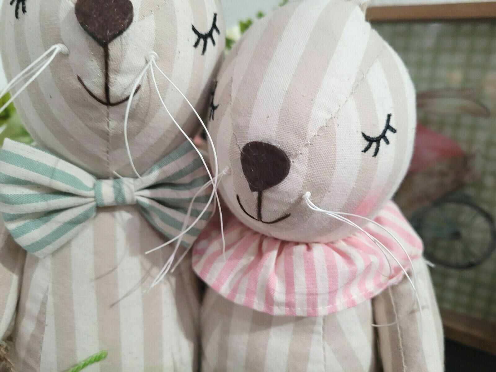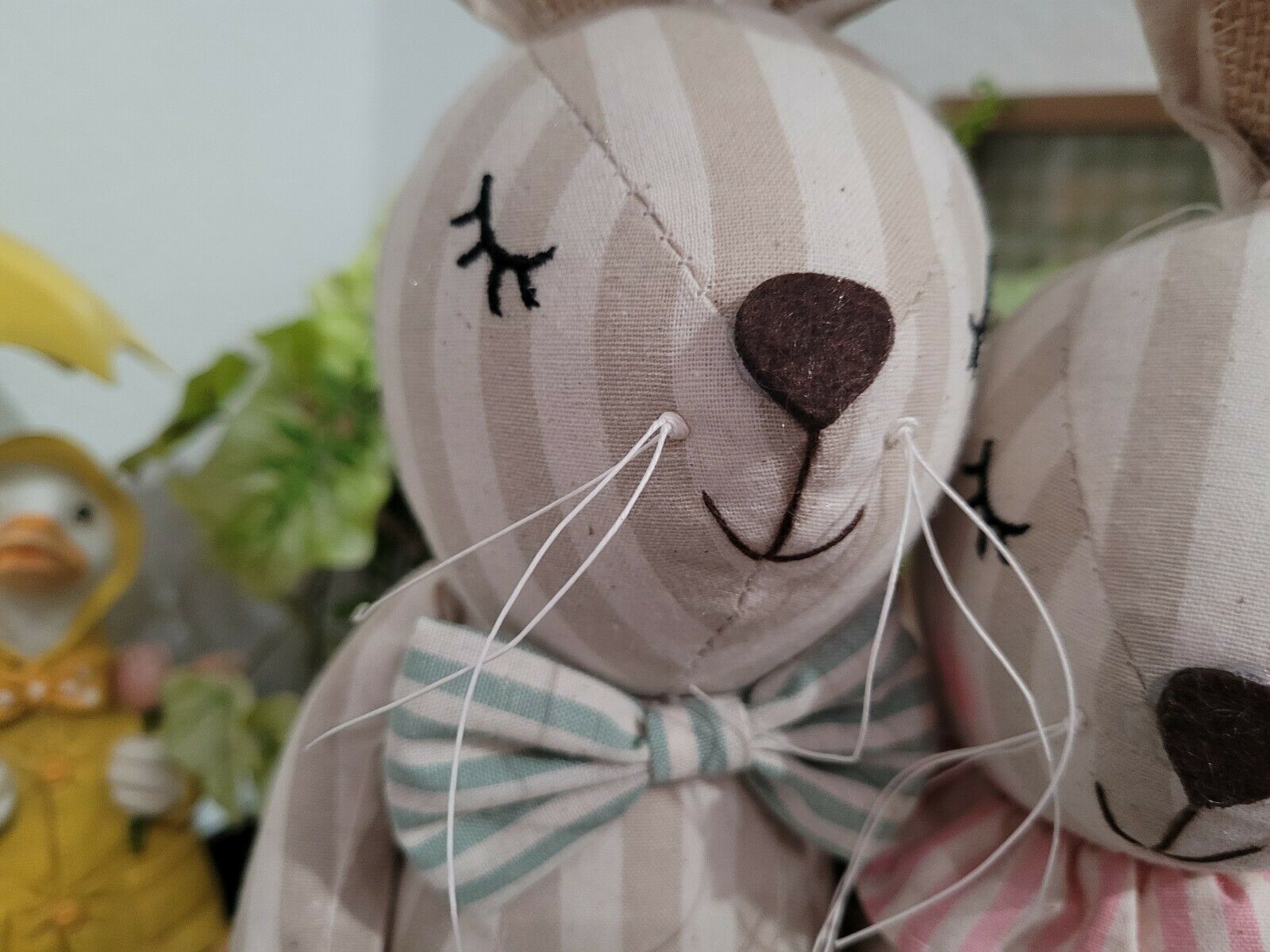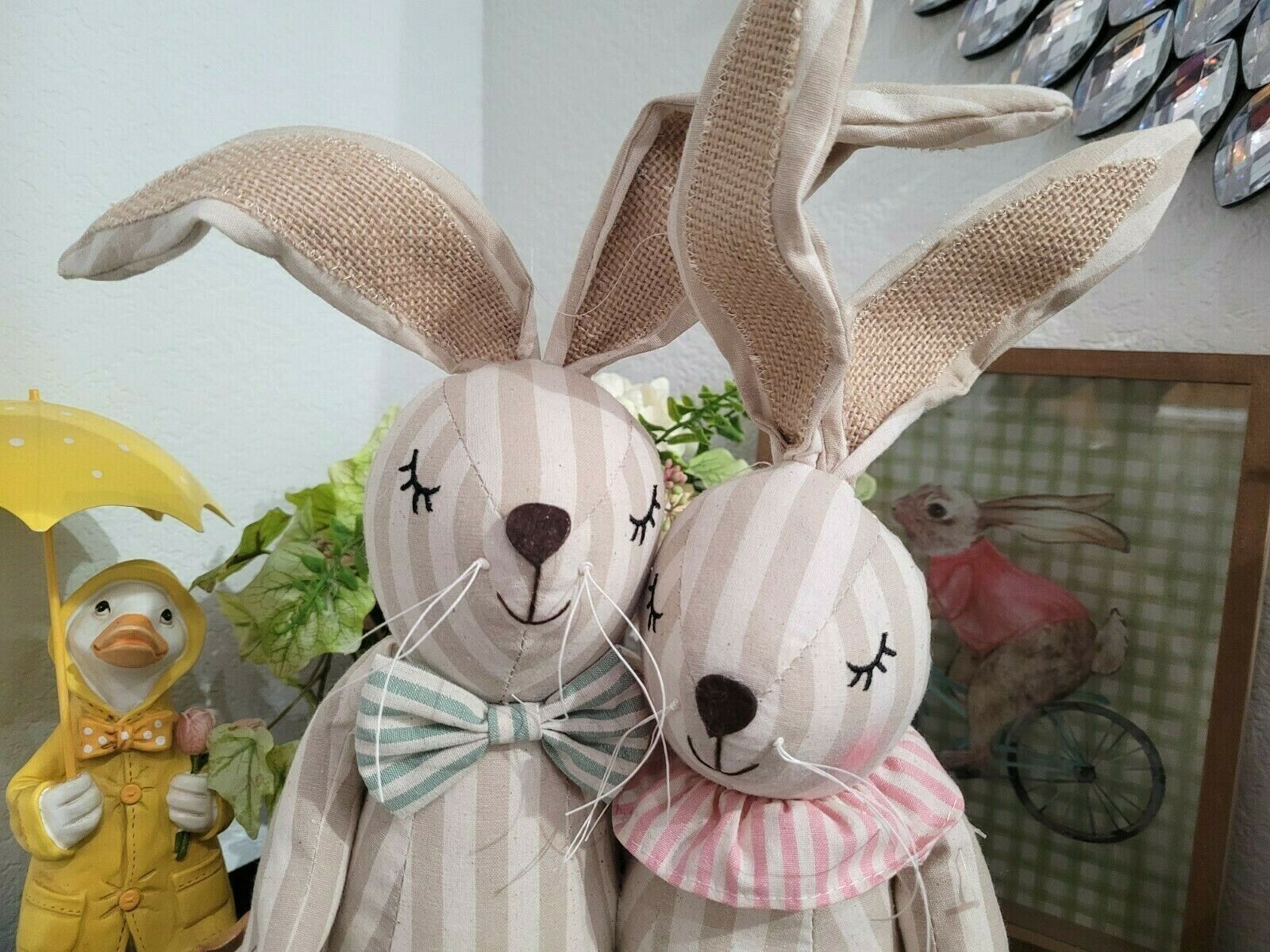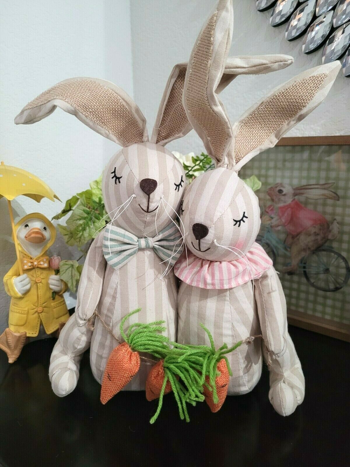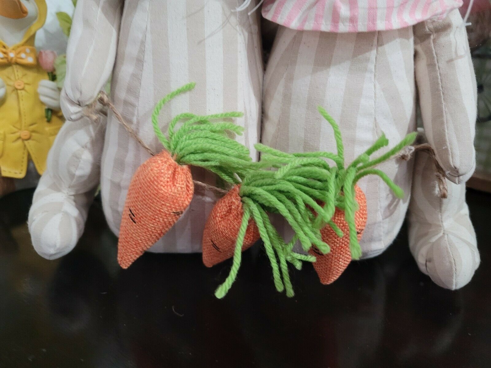Up for sale is this adorable shelf sitter dolls for your Easter decor. These are soooo adorable!! The 2 dolls are stuck together and there holding a garland with carrots. The boy doll has a cute bow tie and they each have a fluffy pom pom tails. These stand approx 15.5" tall from bottom to tip of ear. There bottoms are weighed down.