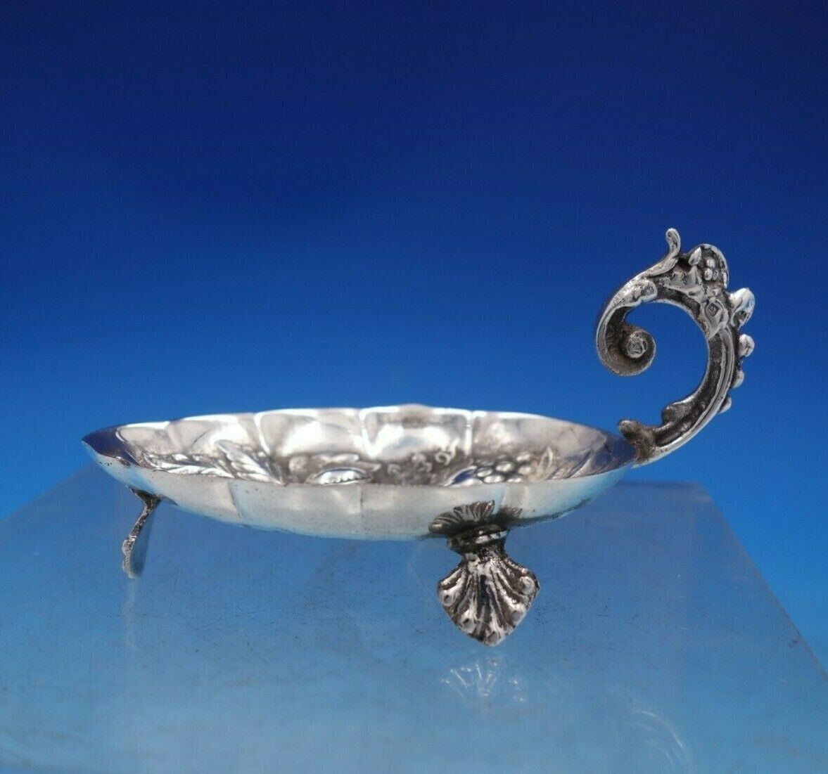Lovely Egyptian sterling silver nut dish featuring cast repousse fruit and flowers with applied handle and shell feet (maker unknown). This dish measures 2" tall x 3 7/8" x 2" and weighs 1.7 troy ounces. It is not monogrammed and is in good vintage condition. Beautiful!