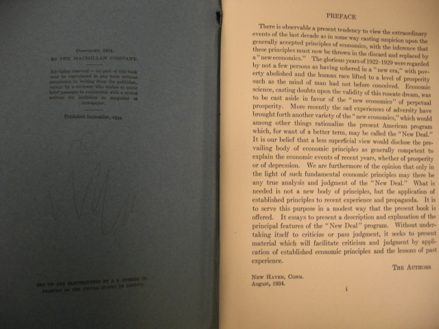 Wraps. Condition: Good. Presumed First Edition, First printing. The authors were associated with Yale University. Taped spine binding. Fred Rogers Fairchild (August 5, 1877 - April 13, 1966) was an American economist and educator. Fairchild earned his Ph.D. from Yale University in 1904. Fairchild taught economics at Yale for many years. He was a holder of the Knox Chair of Economics. He was published widely, and his work included well received text books. His primary field of study was federal taxation in the United States. In a 1920 journal article published in the American Economic Review. Edgar Stevenson Furniss was the longest service Dean of the Yale Graduate School (1930 - 1950). He was also the Professor of Political and Social Science. Norman Sydney Buck was a Professor of Political Economy. Chester Howard Whelden, Jr. was an Instructor of Political Economy at the time this was published. The authors wrote that: " the present American program which, for want of a better term, may be called the "New Deal". It is our belief that a less superficial view would disclose the prevailing body of economic principles as generally competent to explain the economic events of recent years, whether or prosperity or of depression. We are furthermore of the opinion that only in the light of such fundamental economic principles may there be any true analysis and judgment of the "New Deal". What is needed is not a new body of principles, but the application of established principles to recent experience and propaganda. It is to serve this purpose, that the present book is offered. It essays to present a description and explanation of the principal features of the "New Deal" program. Without undertaking itself to criticize or pass judgment, it seeks to present material which will facilitate criticism and judgment by application of established economic principles and the lessons of past experience.".
