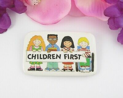 CHILDREN FIRST - This rectangular pin shows four kids holding a sign that reads "Children First" in their colorful clothes. The Company is "Love a Teacher".