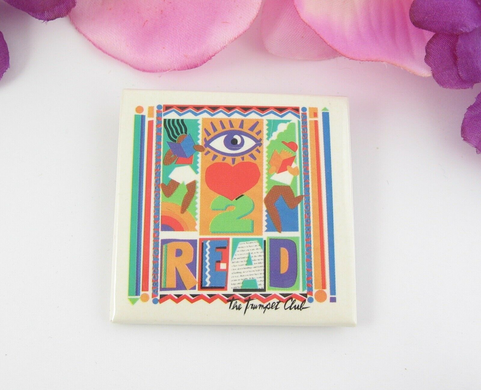 I LOVE TO READ - This square pin is an artsy pin full of colors. The image of an Eye stands in for the "I" and a Heart stands in for the word "Love". A green number 2 is under that and the word "READ" in colorful bold letters. The company that made this pin is called "The Trumpet Club" and it is dated 1991.