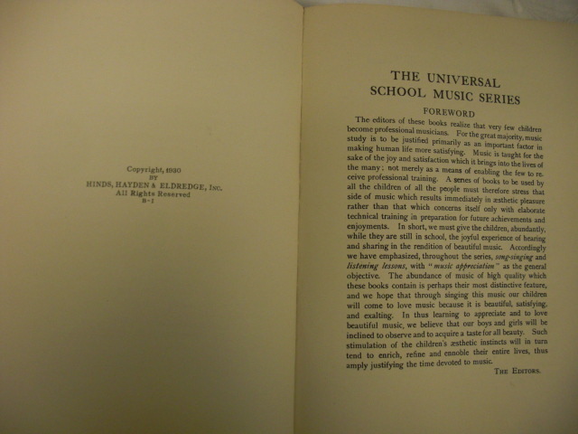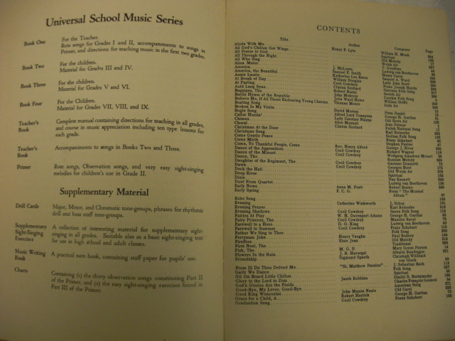 Quoted from the editor’s foreword: “We have emphasized, throughout the series, song-singing and listening lessons, with music appreciation; as the general objective. The Abundance of music of high quality which these books contain is perhaps their most distinctive feature “.