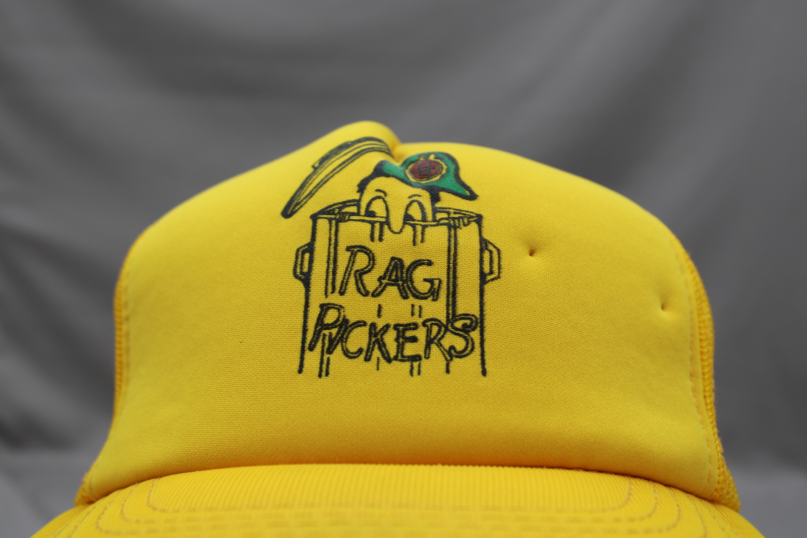 Up for sale is a vintage screened trucker hat. It has a yellow base colour. The front of the hat has a cartoon graphic of a man popping out of a garbage can with the wording rag pickers beside it. What great vintage hat do not miss out on it.