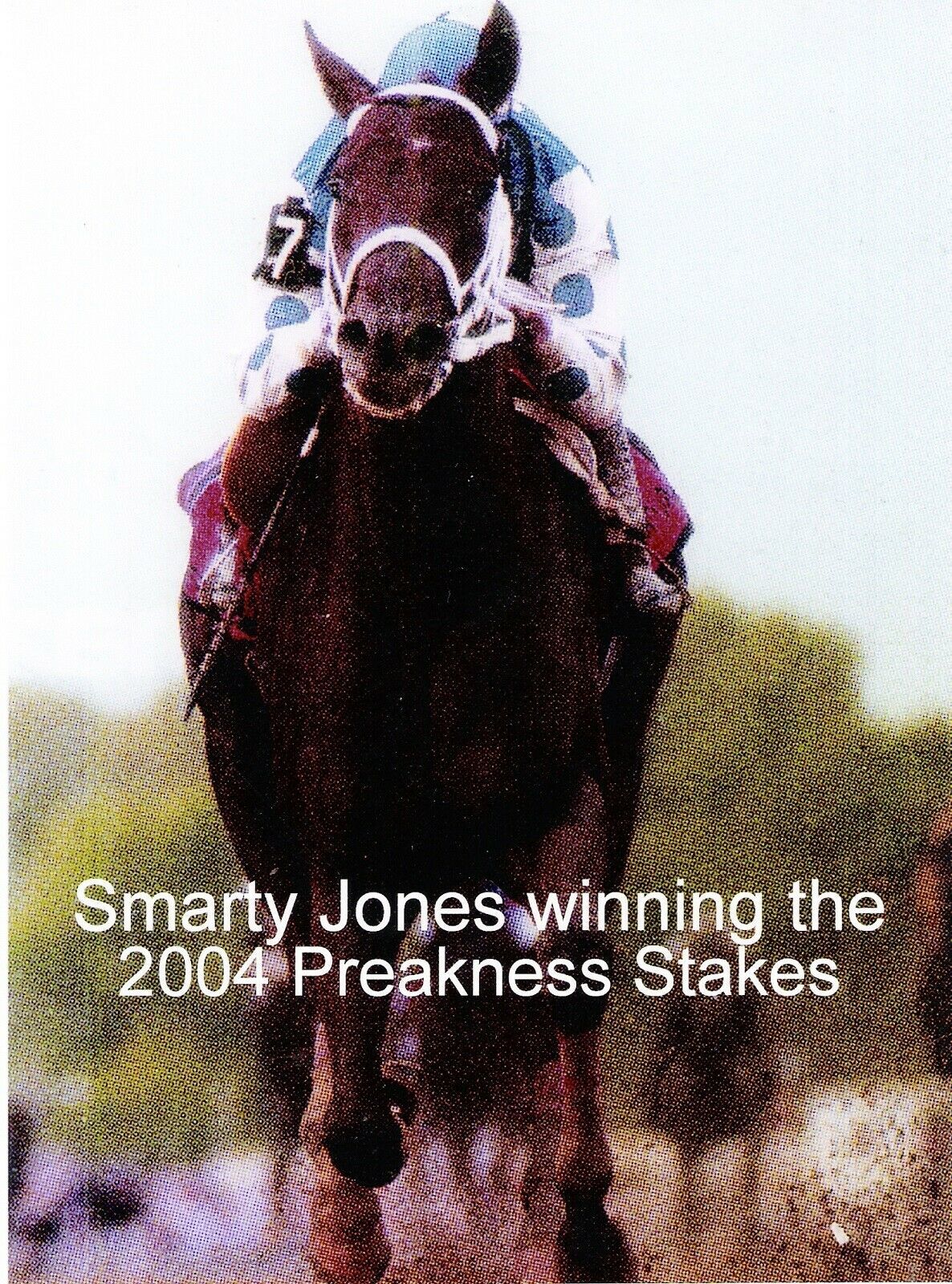 This is a captioned, 8" x 10" Head - On color photo of SMARTY JONES, with Stewart Elliott up winning the 2004 Preakness Stakes. This photo was printed on a top quality photographic paper and is in MINT Condition. SMARTY JONES' "Complete Racing History" will come with this photo. FREE packaging and First Class Postage shipping in the U.S.A. International Postage cost will be determined by the Country of the Buyer. If you buy more than one item please pay for all the items with one combined PayPal payment rather than paying for each item individually. If you want this photo printed "without the captioning", add that request in "Note To Seller" with your PayPal payment. Otherwise it will come captioned, as shown. If you would like this photo printed in a larger size I can offer a 16" x 20" for $60.00 or a 24" x 30" for $100.00. Mailing tube and First Class Postage shipping is included in the U.S.A. To pay for the 16" x 20" size just order three 8" x 10"s and pay $60.00. Also, add in "Note to Seller", with your PayPal payment, that you are ordering the 16" x 20" size. To pay for the 24" x 30" size just order five 8" x 10"s and pay $100.00. Also, add in "Note to Seller", with you PayPal payment, that you are ordering the 24" x 30" size.