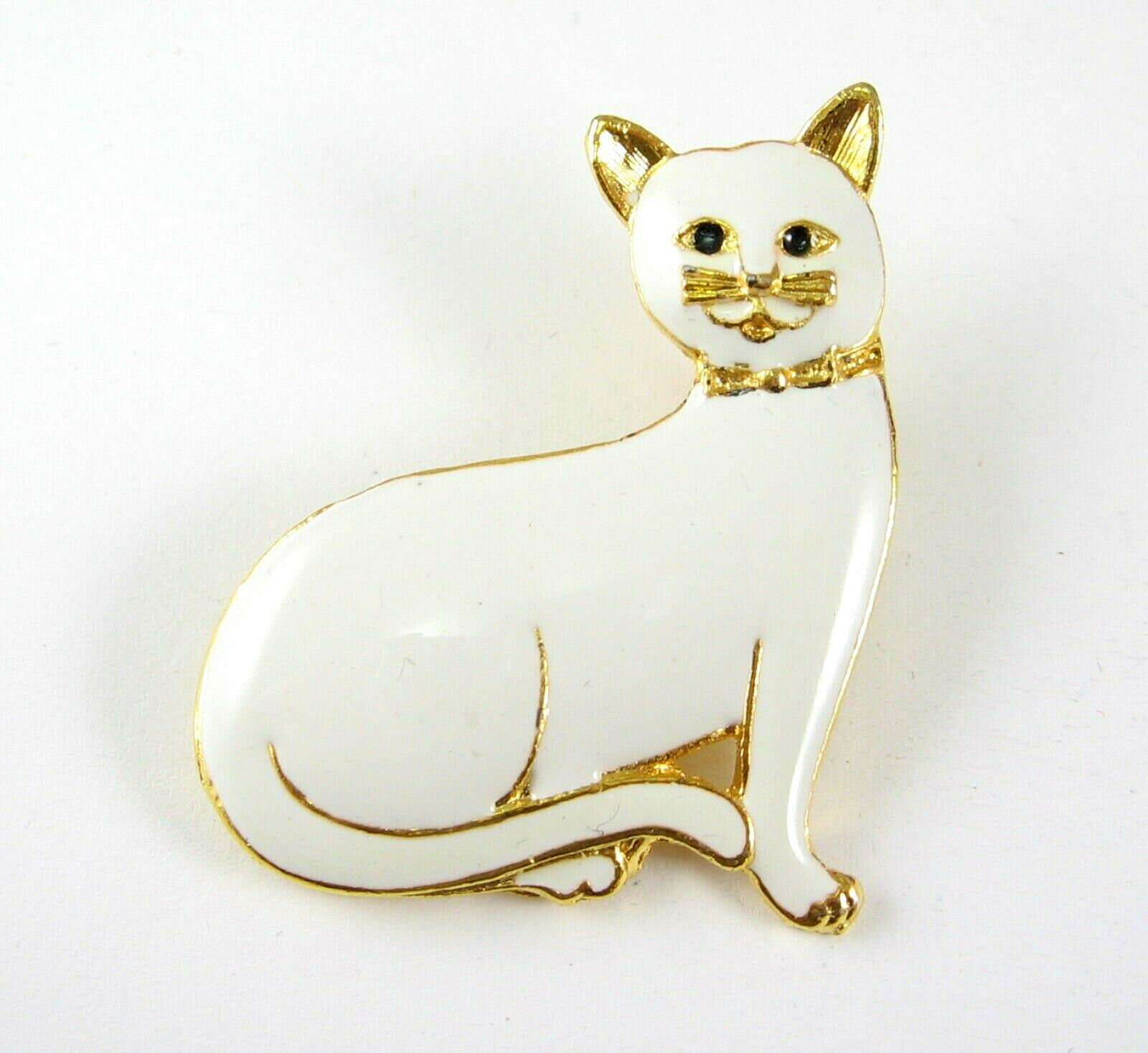 In a goldtone metal, this is a vintage WHITE ENAMEL CAT PIN!