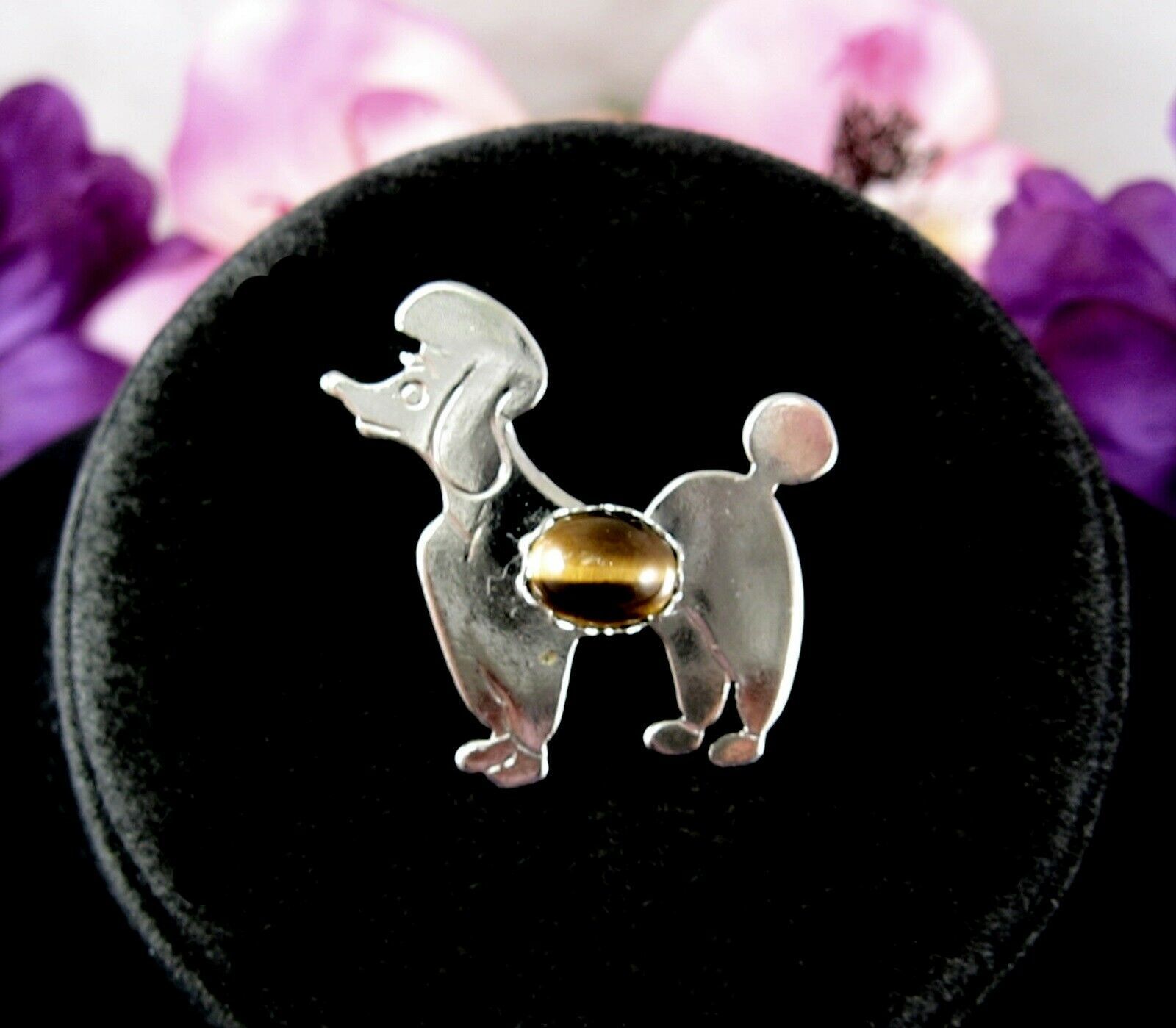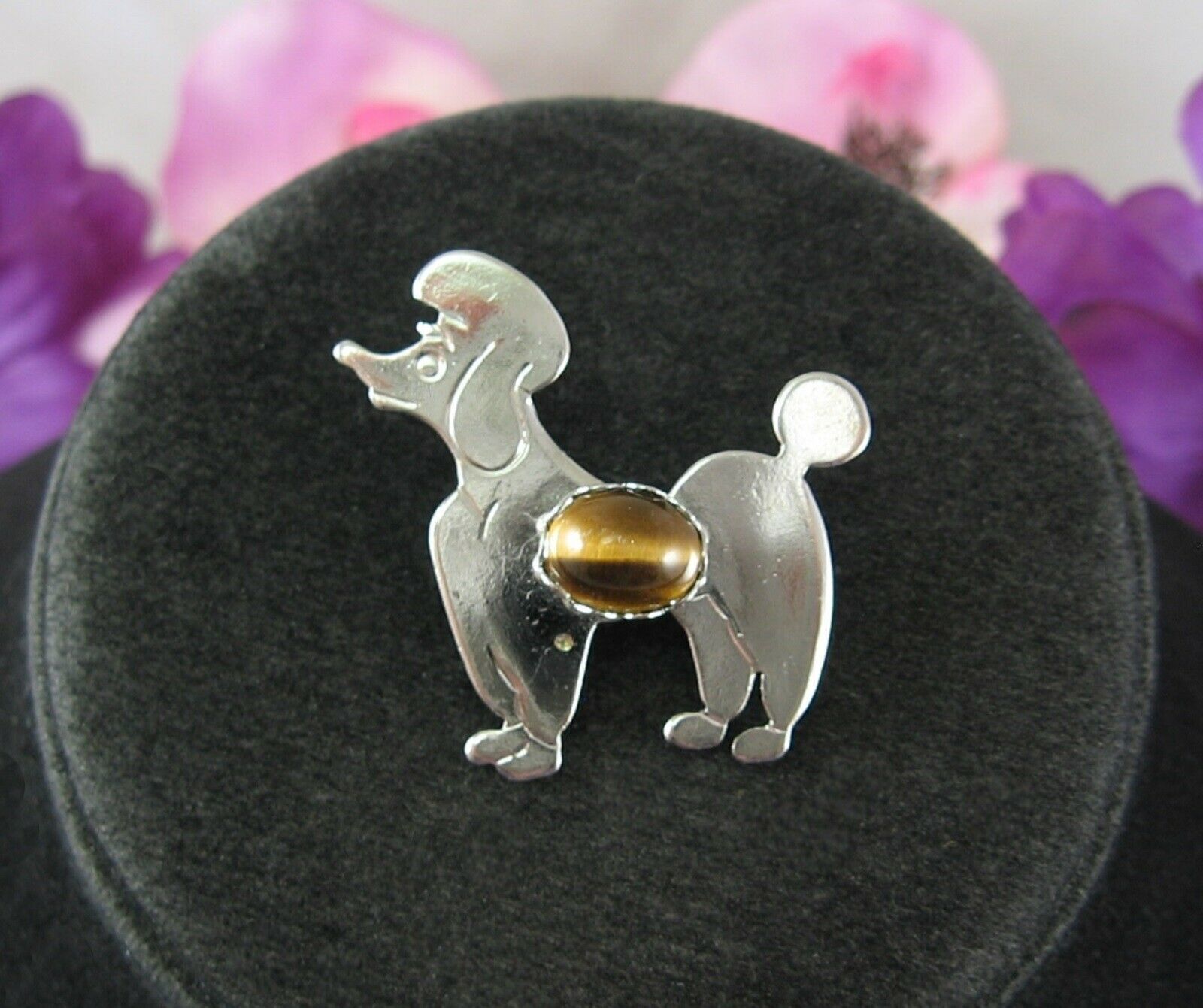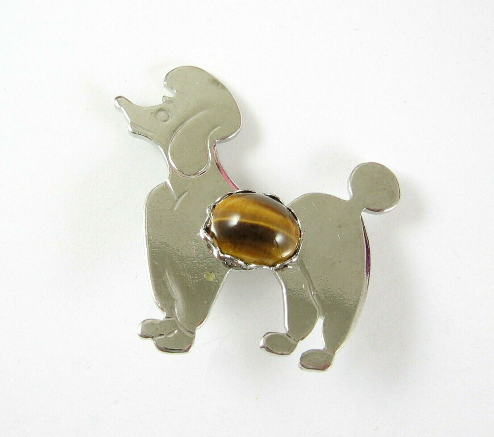 TIGER'S EYE French POODLE PIN Vintage Brooch Standard Silvertone Fancy Dog