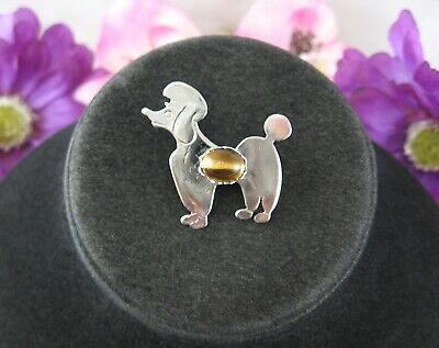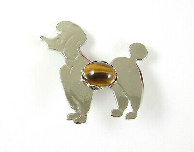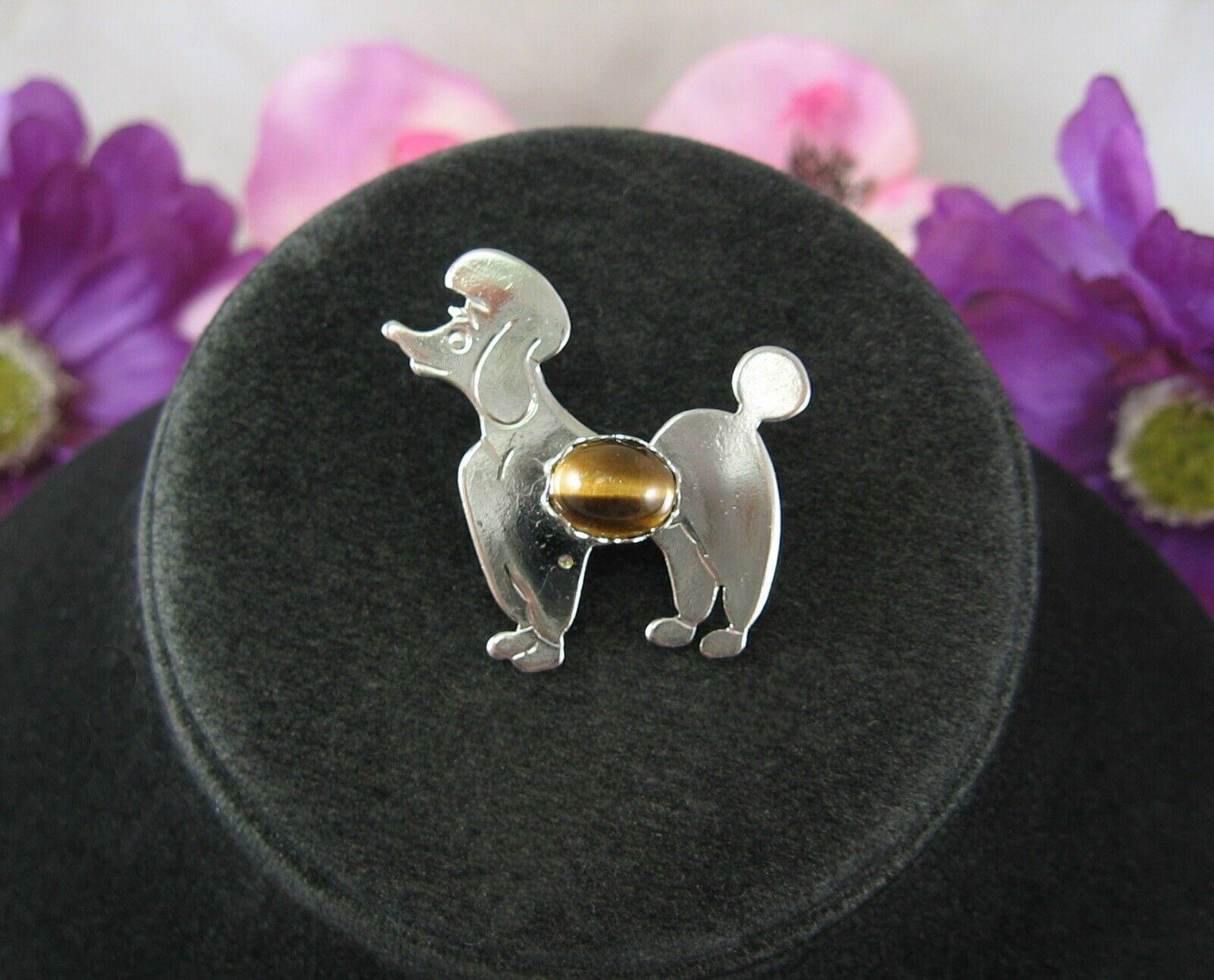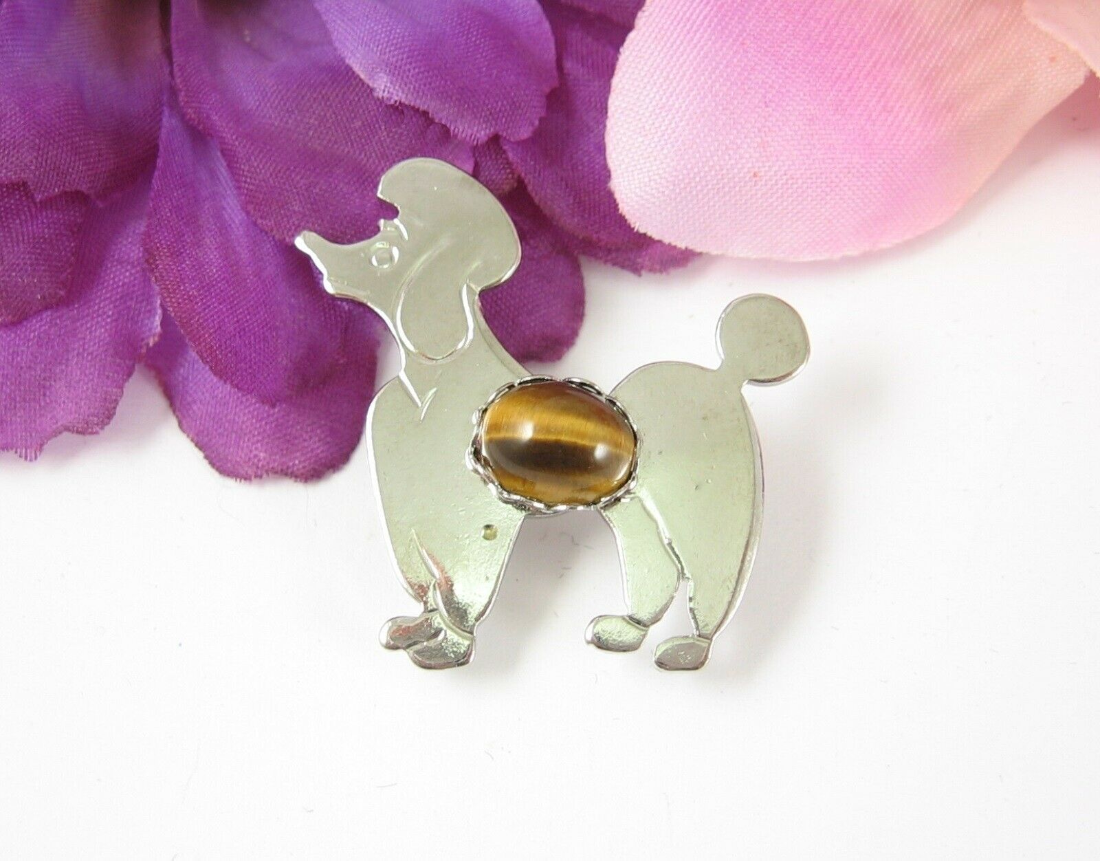 TIGER'S EYE French POODLE PIN Vintage Brooch Standard Silvertone Fancy Dog