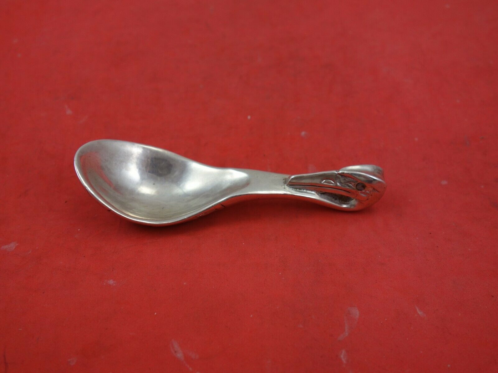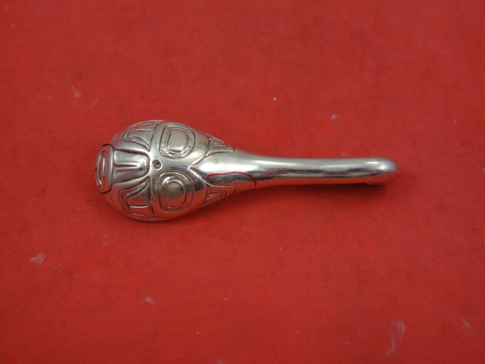 Native American sterling silver Baby Spoon, wider bowl, very heavy with bird motif handle with inlay abalone eyes, 4 1/4 " by Patty Fawn. Patty Fawn, and daughter Nakweesee, are artists from the Lelooska Tribe of Northwest Coast Washington and are known for carvings of animals of the northwest. They were both adapted by the Kwakwaka'wakw tribe of British Columbia. . It is not monogrammed and is in good vintage condition.