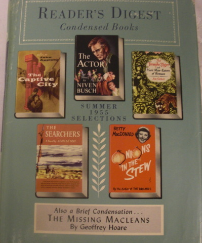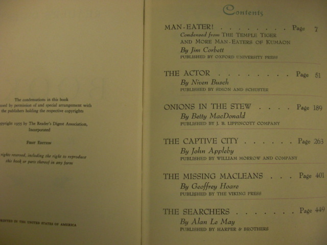 Pre-owned Reader's Digest Condensed Books Summer 1955 Selections Hardcover Book. Includes: The Captive City, The Actor, The Temple-Tiger and More Man-Eaters of Kumaon, The Searchers, Onions in the Stew.