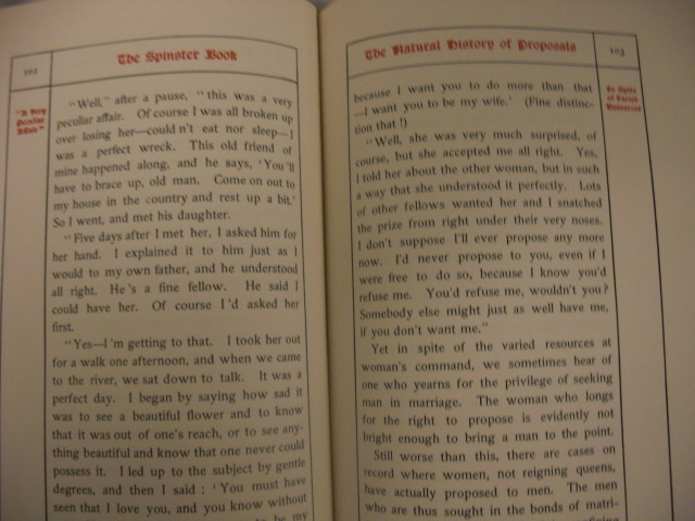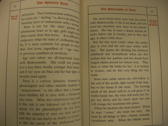 The author has an amazing sense of humor, sometimes she was being serious or sarcastic. There are some parts which are very true, some which are beautiful, and many which are! The Spinster Book is basically a dating/courtship guide, which very much assumes that one should never, ever attempt to talk to the opposite gender like a normal human being. Indeed, it even seems to suggest that too many friendships with men put a woman in the ‘friend zone’ forever: “To one distinct class of women men tell their troubles and the other class sees that they have plenty to tell. It is better to be in the second category than in the first.” It’s a bit like Men Are from Mars, Women Are from Venus, but due to being 111 years out of date it’s even more laughable. The chapter titles are a treat in themselves: Notes on Men, Concerning Women, The Philosophy of Love, The Lost Art of Courtship, The Natural History of Proposals, Love Letters: Old and New, An Inquiry into Marriage, The Physiology of Vanity, Widowers and Widows and The Consolations of Spinsterhood,