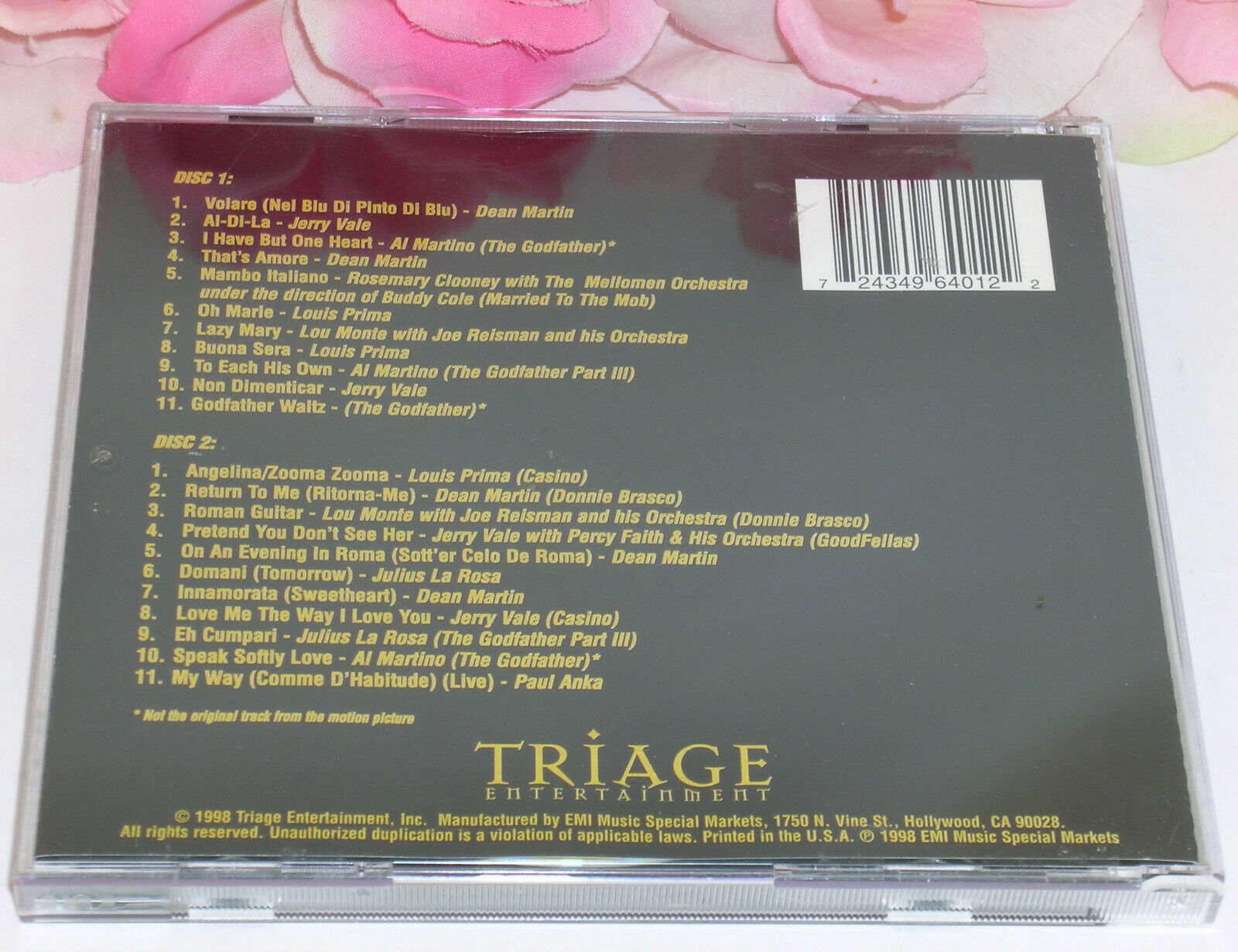 You are buying a used CD's with Various artists the album is called "Mob Hits" Thee are 2 gently used CD's from Triage Entertainment. The album was produced in 1998. The cd's play, there are no visible scratches on either disc. The cd's are in the original case with inserts. Please look closely at the pictures for item condition. Some of the artists are Dean Martin, Jerry Vale, Al martino, Louis Peima, and Paul Anka.