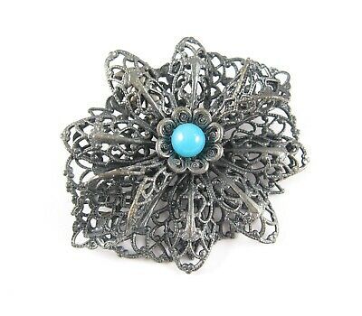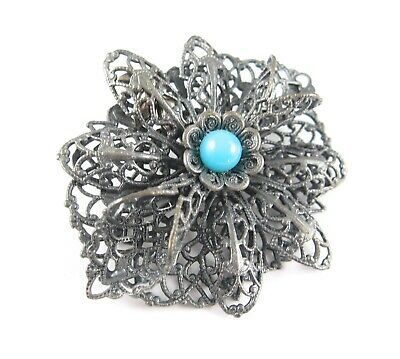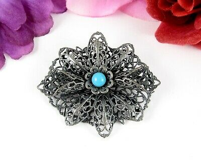 LACY PIN Vintage Dark Silvertone Filigree BLUE BEAD BROOCH Flower HIDDEN EXTRAS