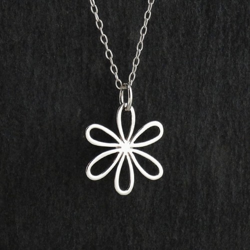 The featured pendant is cast in .925 sterling silver and showcases an 8-petal flower adorned with faux seashell enamel detailing then finished with a sturdy bail that can accommodate most chain sizes.