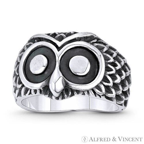 The featured ring is cast in oxidized .925 sterling silver and showcases a finely-crafted owl centerpiece finished with a solid sturdy band.