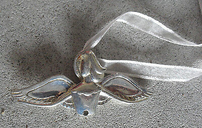 Unique, seeming modern, heavy silver metal, maybe pewter, angel with torso and wings, Christmas ornament in the picture. Great shape. About 3 1/4 inches wide.