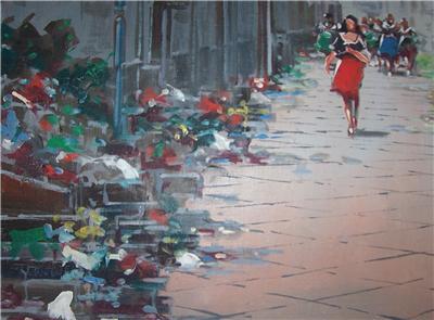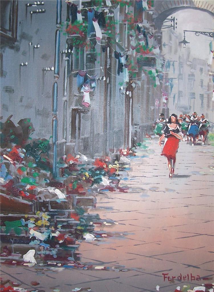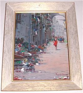 Mario Ferdelba is a 20th Century a contemporary Italian artist, was born in Naples, Italy famous for his street scenes of Naples and Florence, Italy as well as Paris, France. He often incorporates market scenes and always with a good bit of color. Ferdelba is extremely talented and his unique distinctive brush strokes are very impressionistic and expressionistic. He brings the paintings to life. This painting is believed to date circa 1950's. The painting is signed Ferdelba in the lower right hand corner.