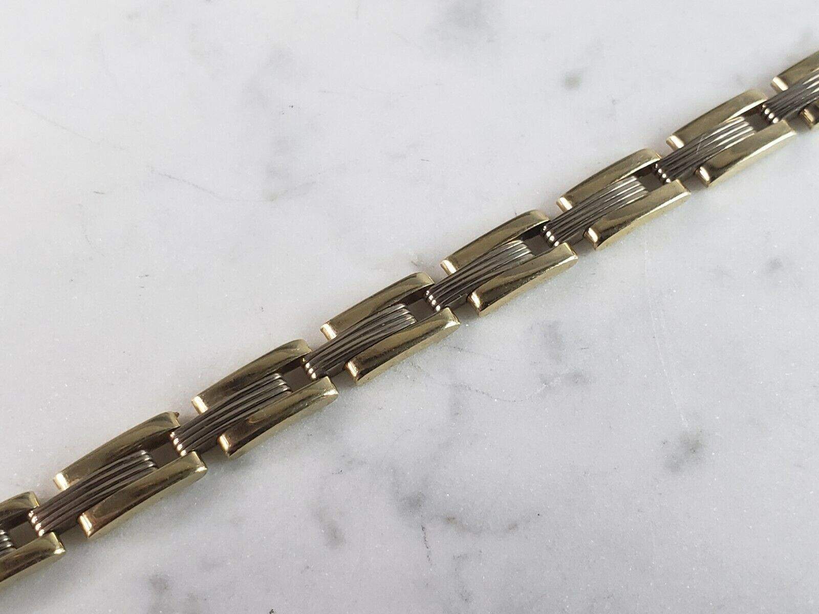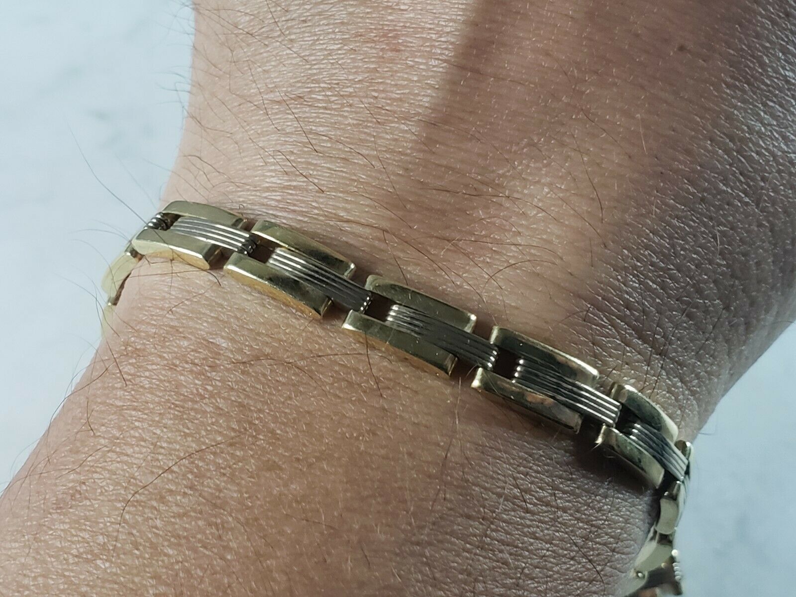 A MENS VINTAGE ESTATE 14K YELLOW WHITE GOLD CHAIN LINK BRACELET. BRACELET IS 8" LONG BY 1/4" WIDE, AND WEIGHS 18.3g. BRACELET IS MARKED 14K, ITALY. THIS WOULD MAKE A LOVELY GIFT FOR THAT SOMEONE SPECIAL. ANY QUESTIONS, PLEASE ASK. BE SURE TO CHECK OUT SOME OF MY OTHER GREAT ITEMS UP FOR SALE. THANK YOU.