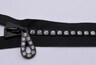 Each tooth of the zipper contains a genuine Swarovski Austrian crystal set into it. The slider glides over each rhinestone to create one line of rhinestones up the zipper.