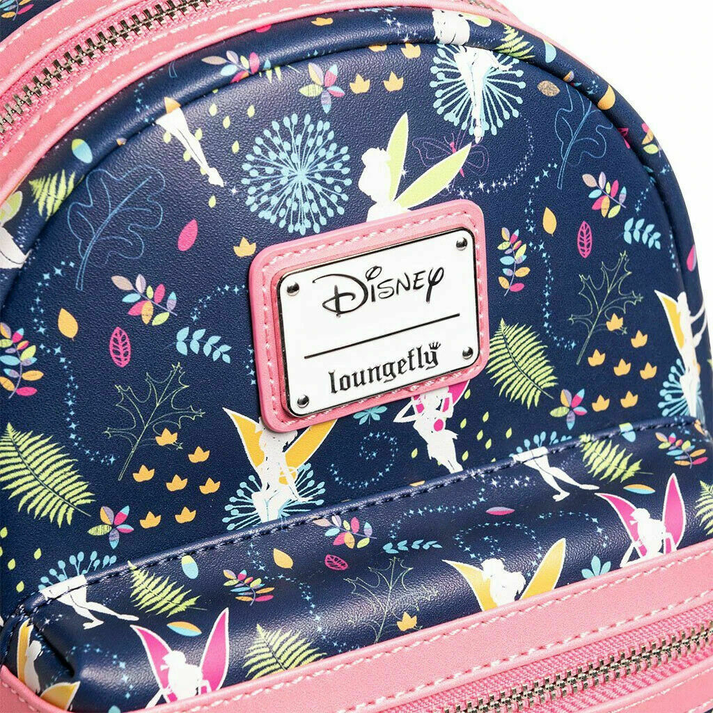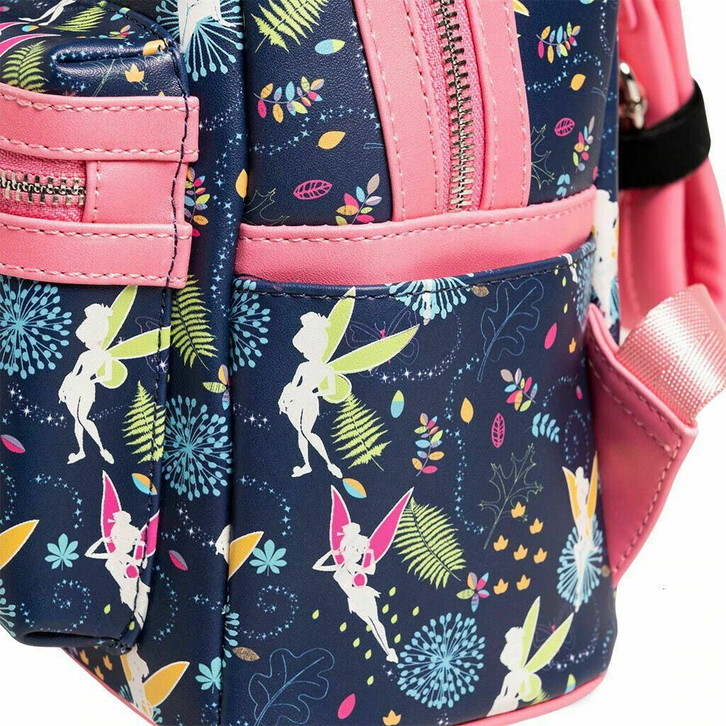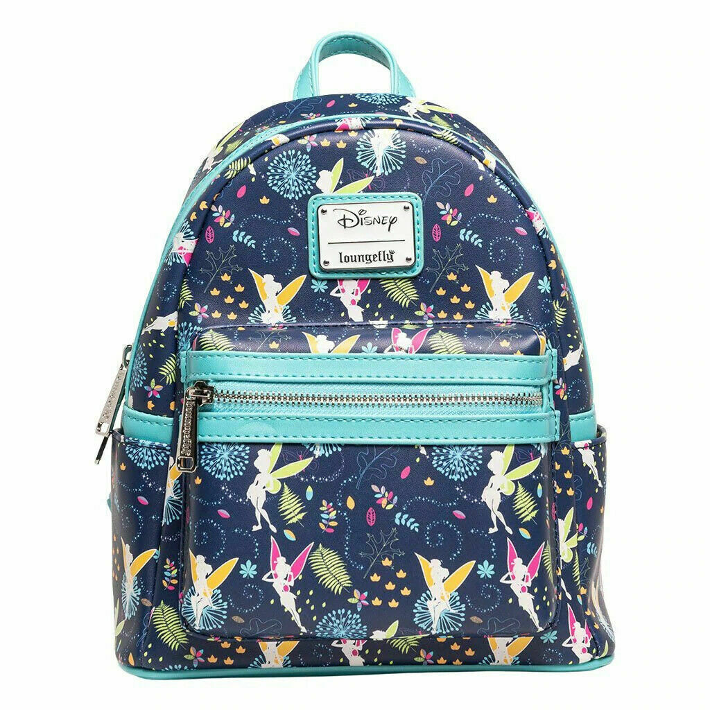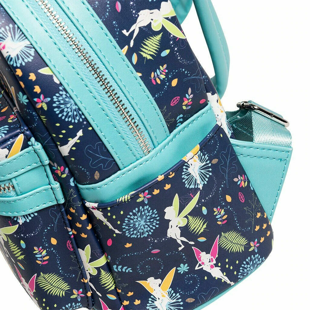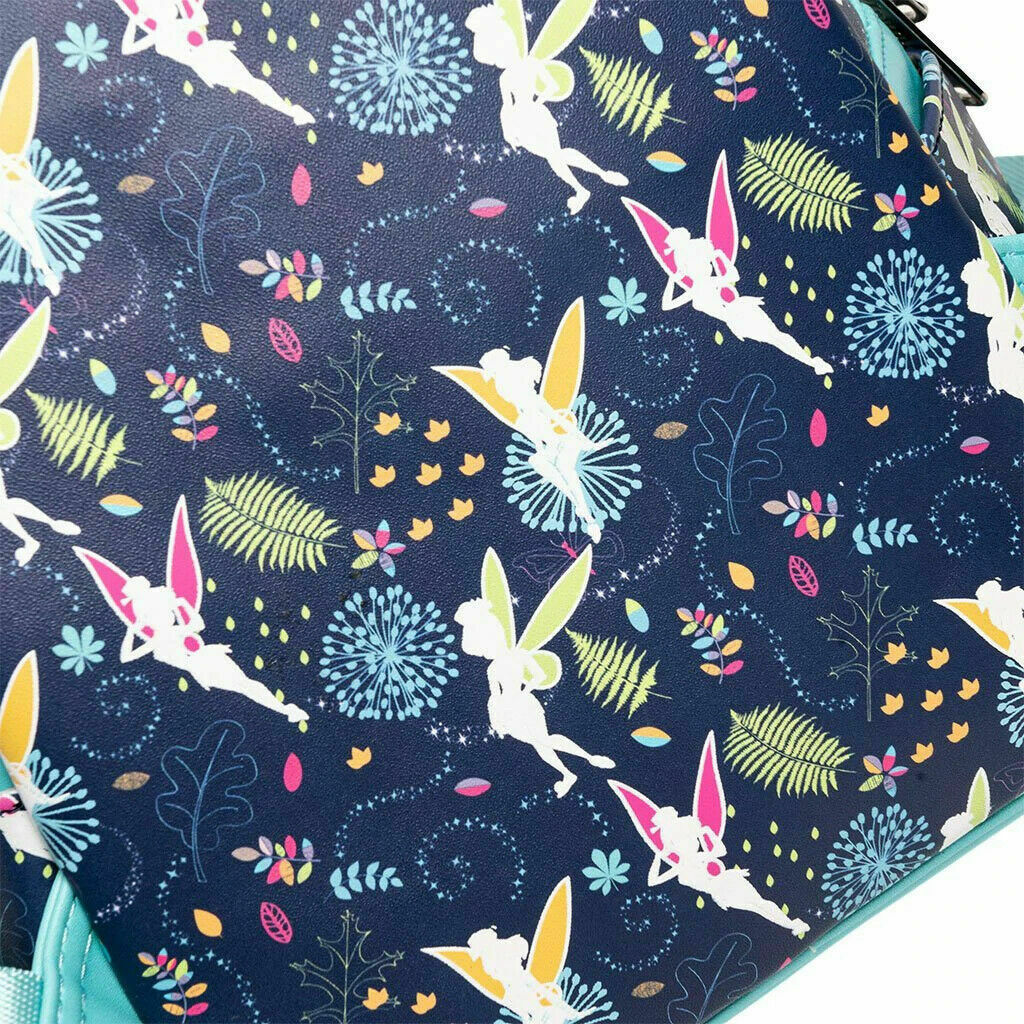 Exclusive Loungefly Disney Tinkerbell Glow in the Dark Allover print mini backpack with pink OR teal straps is sprinkled to perfection with pixie dust! Featuring an adorable allover print, pink straps OR teal straps, two side pockets, one front and a main compartment. Comes with everything you need to keep your belongings safe when you fly off to Neverland.