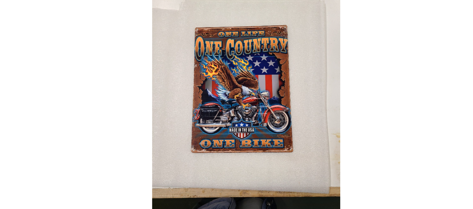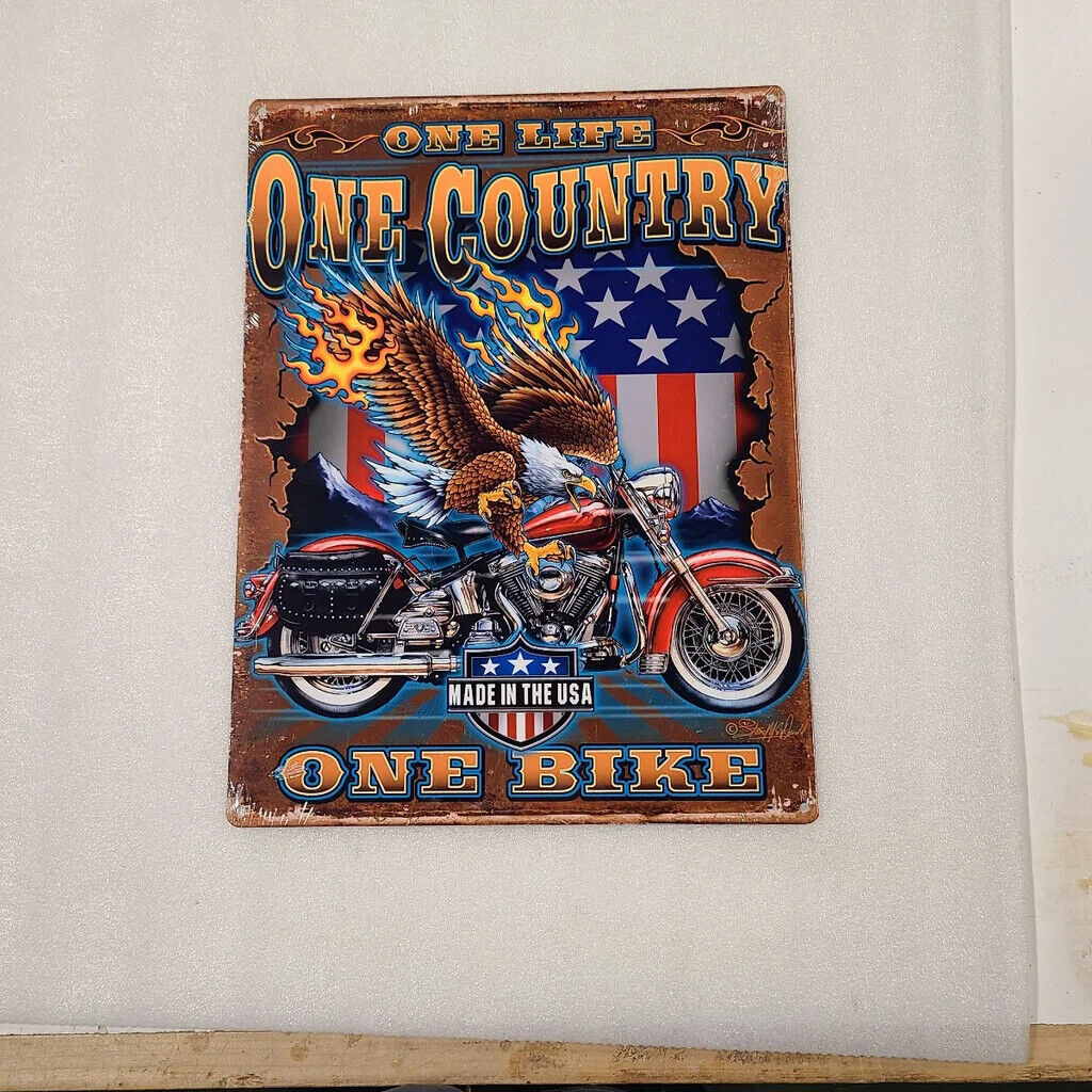One life one country and one bike motorcycle faux vintage steel metal sign this is 16 X 12 inches great for sport bar, den or bedroom kitchen, man cave, kids room, office, school, garage, or hang in house or home, anywhere decor is needed. Great for birthday or Christmas gift.
