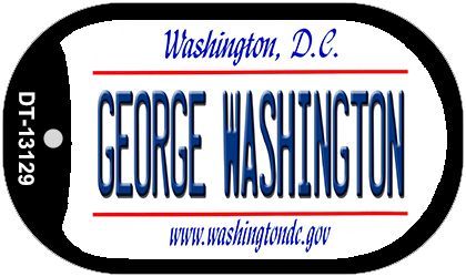 George Washington Novelty Metal Dog Tag Necklace DT-13129. 1.5" x 2" dog tag kit including 15" silver chain and silencer. Made of the highest quality aluminum for a weather resistant finish. It is lightweight durable. Proudly made in the USA.