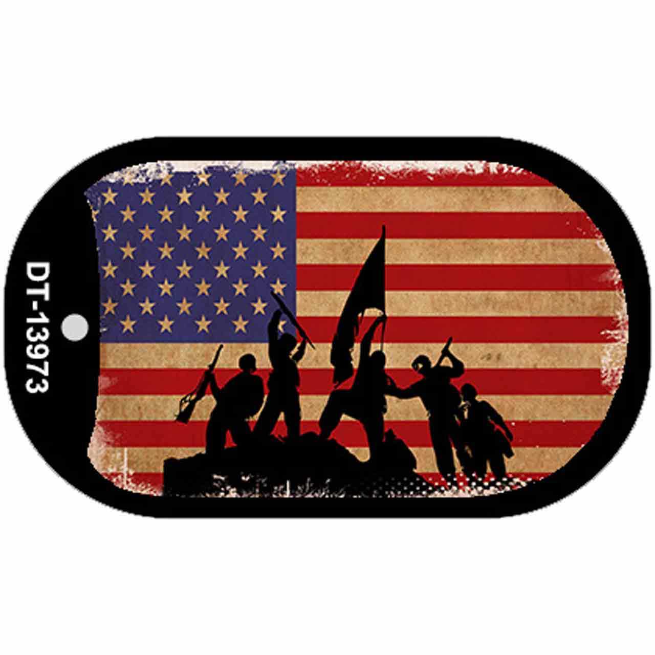 Grunge American Flag with Soldiers Novelty Metal Dog Tag Necklace. 1" x 2" dog tag kit including 15" silver chain and silencer. Made of the highest quality aluminum for a weather resistant finish. It is lightweight durable. Proudly made in the USA.