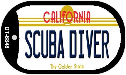 Scuba Diver California Novelty Metal Dog Tag Necklace DT-6848. 1" x 2" dog tag kit including 15" silver chain and silencer. Made of the highest quality aluminum for a weather resistant finish. It is lightweight durable. Proudly made in the USA.