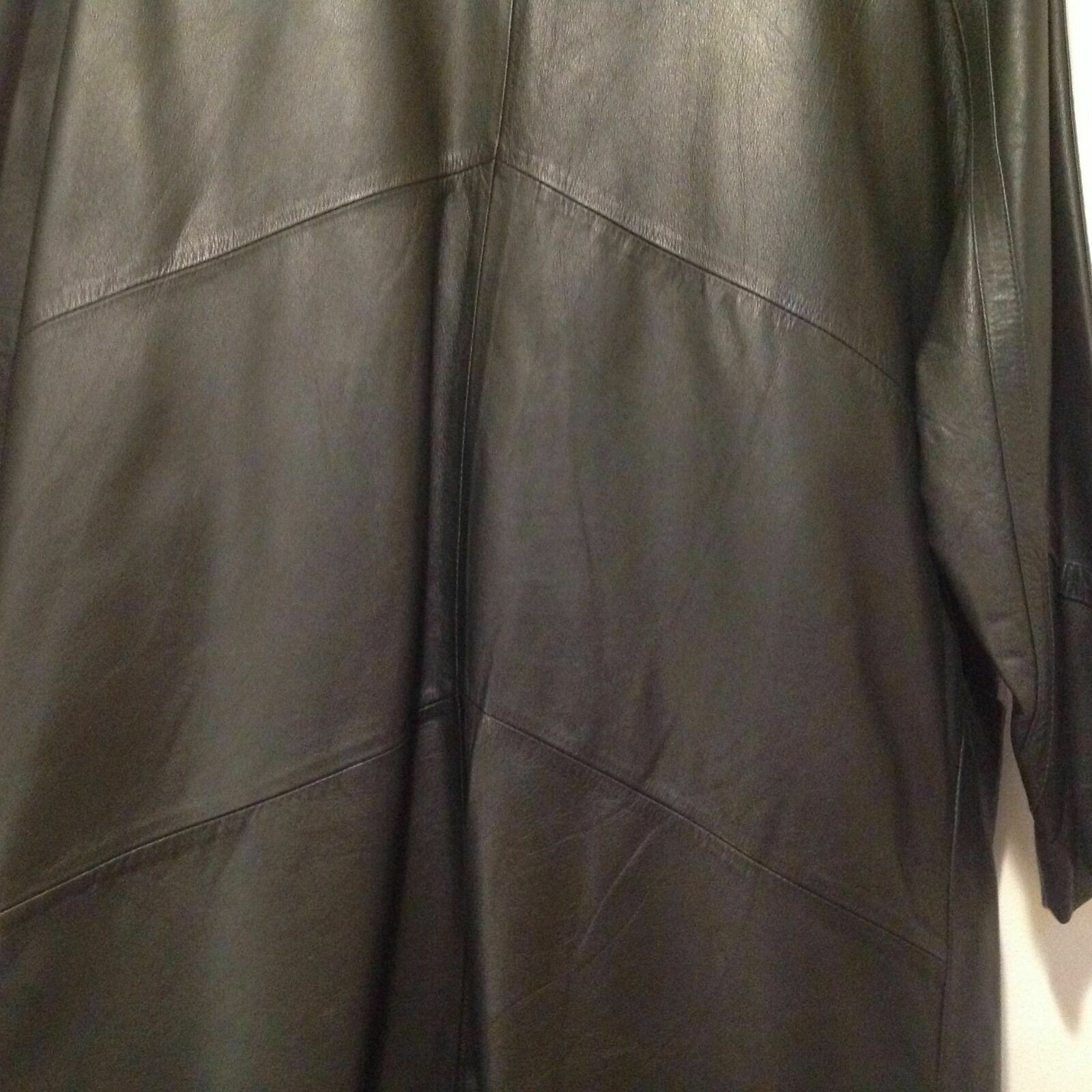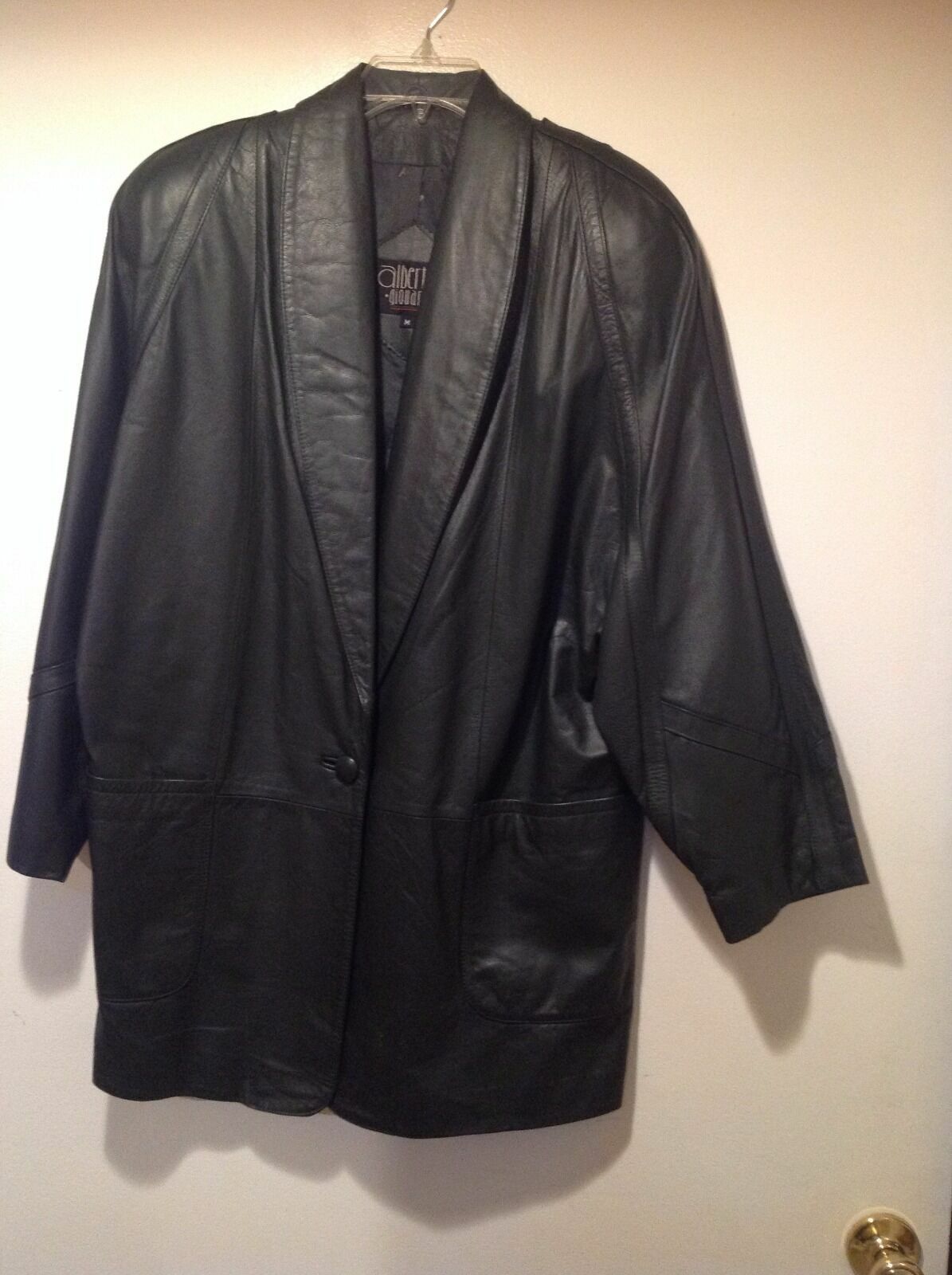 This is classic and timeless blazer style jacket featuring dark green color leather almost as black, one covered button closure, dolmen sleeves, two front pockets, fully lined.