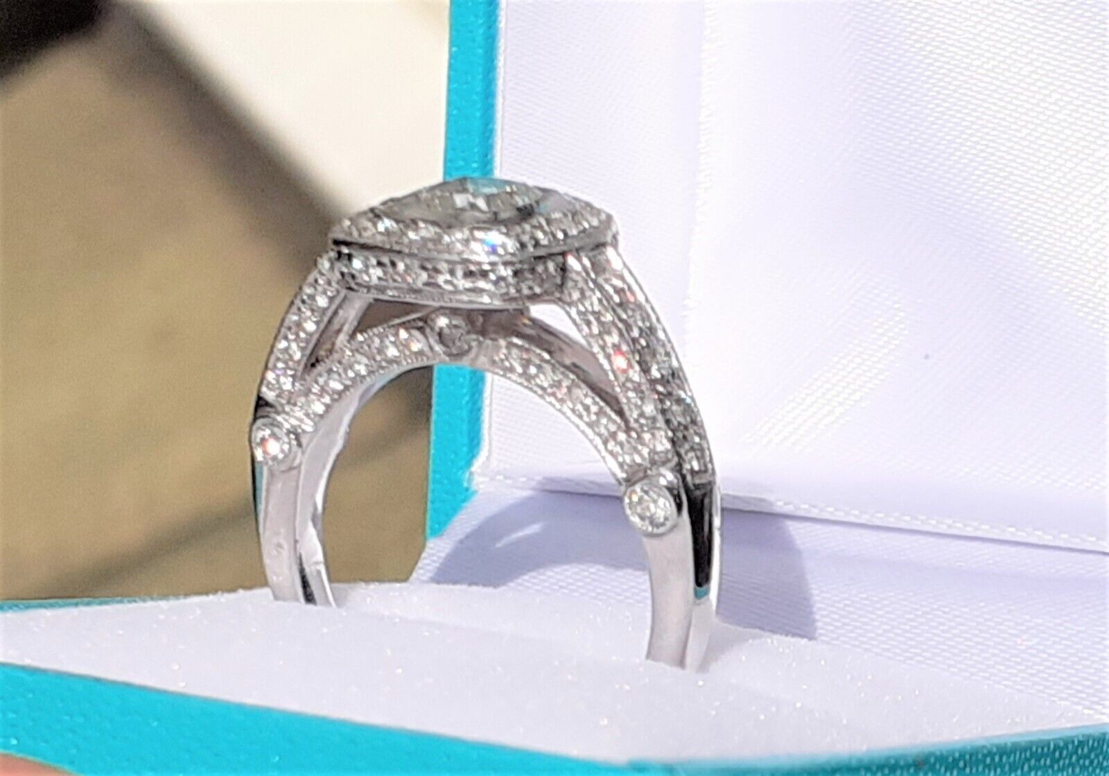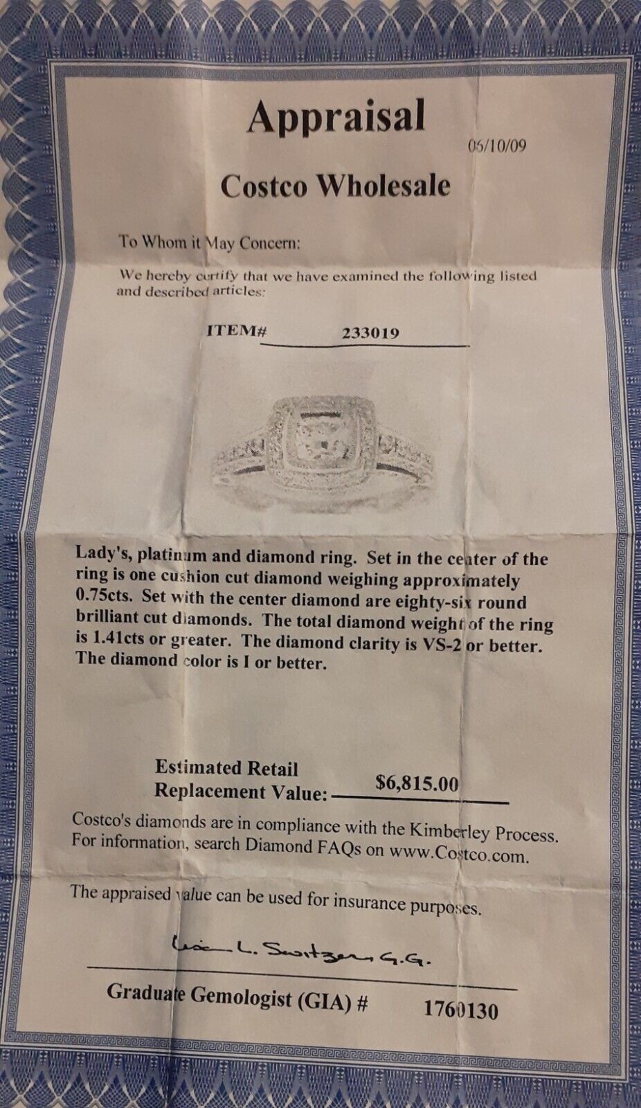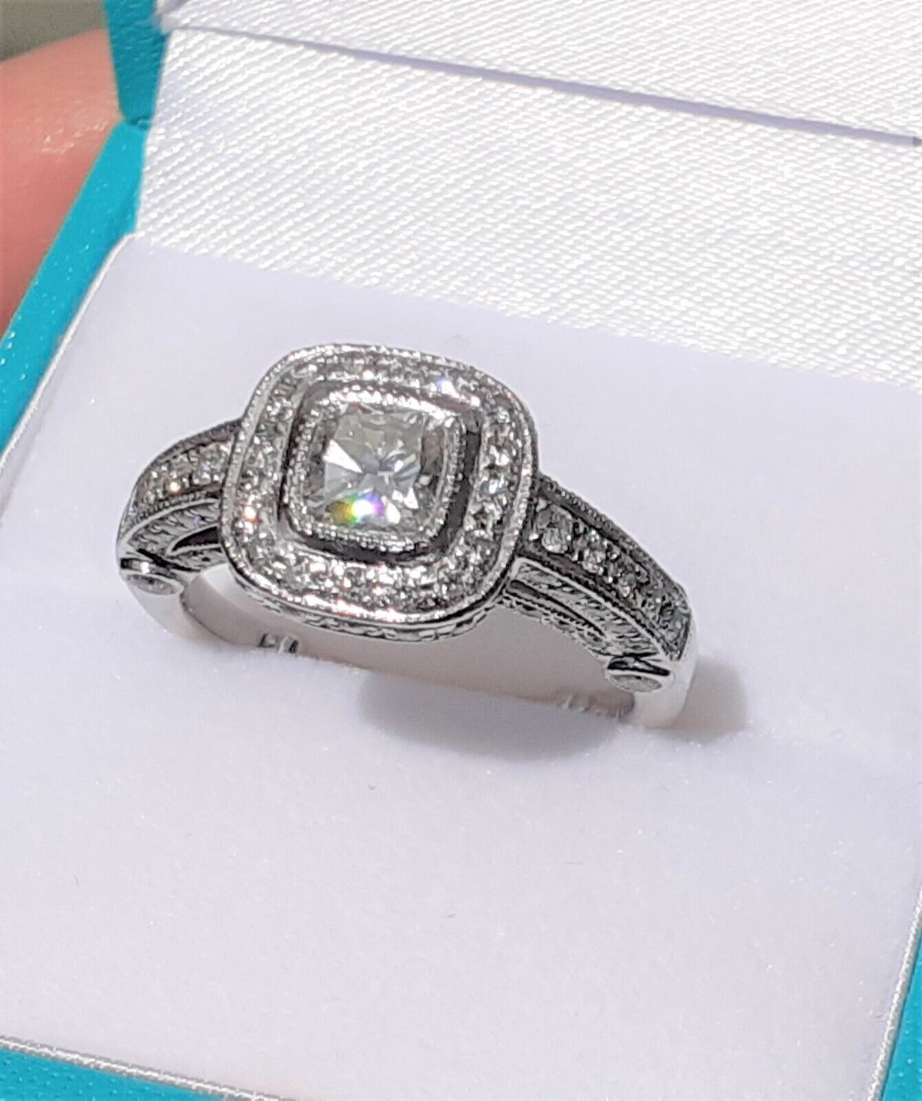 Classic,very pretty,diamond set platinum halo ring with side diamonds.Centre diamond =0.75ct cushion shape diamond H/I colour ,SI1 clarity rubbover set.Halo diamonds and side diamonds are pave set and total 0.66ct approx H colour SI1.The ring is second hand but has been refurbished throughout,incuding millgrained edges renewed and repolished as new(the ring has stabalizing platinum balls inside for ladies with difficult finger joints,these will be removed if not needed and ring will be resized to any size requested free of charge when sold)Please message for more info or images