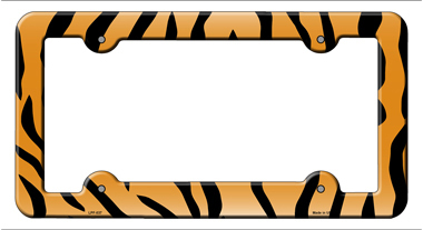 Tiger Print Novelty Metal License Plate Frame LPF-037. Instantly personalize your car with our automotive high gloss molded metal license plate frame. Frames fit standard 6" x 12" license plate tags, individually shrink-wrapped and proudly made in the USA.