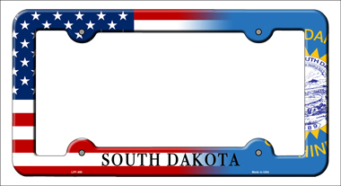 South Dakota|American Flag Novelty Metal License Plate Frame. Instantly personalize your car with our automotive high gloss molded metal license plate frame. Frames fit standard 6" x 12" license plate tags and are individually shrink-wrapped and proudly made in the USA.