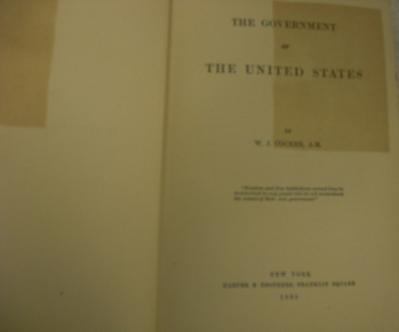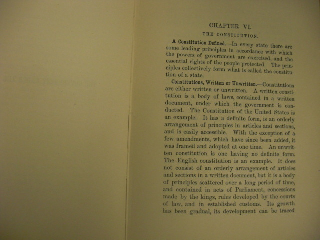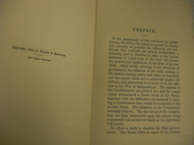 From the Preface: “In the preparation of this text-book for public schools, the author has aimed to present, as clearly and consisely as possible, the influences and conditions that rendered our present Constitution a necessity, an to describe, as fully as the limited character of a text-book of this kind will permit, the powers and limitations of our form of government.”
