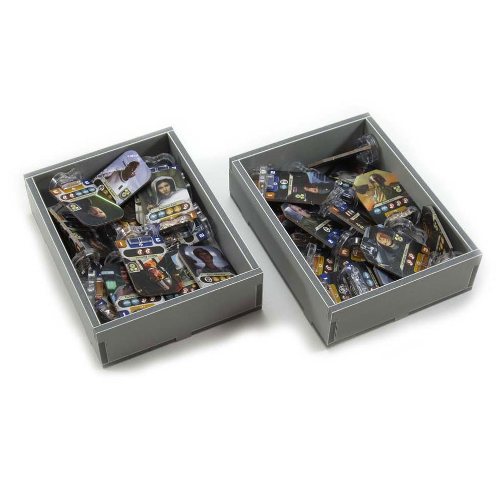 nsert compatible with Star Wars Rebellion, and the Rise of the Empire expansion. The design provides both efficient storage and improved game play. Many of the trays can be utilised during the game, and they greatly aid set-up and clear-away times. The rules and boards act as a lid on top of the trays. There is space for all cards to be sleeved. This product consists of a flat-pack of 10 Evacore sheets.