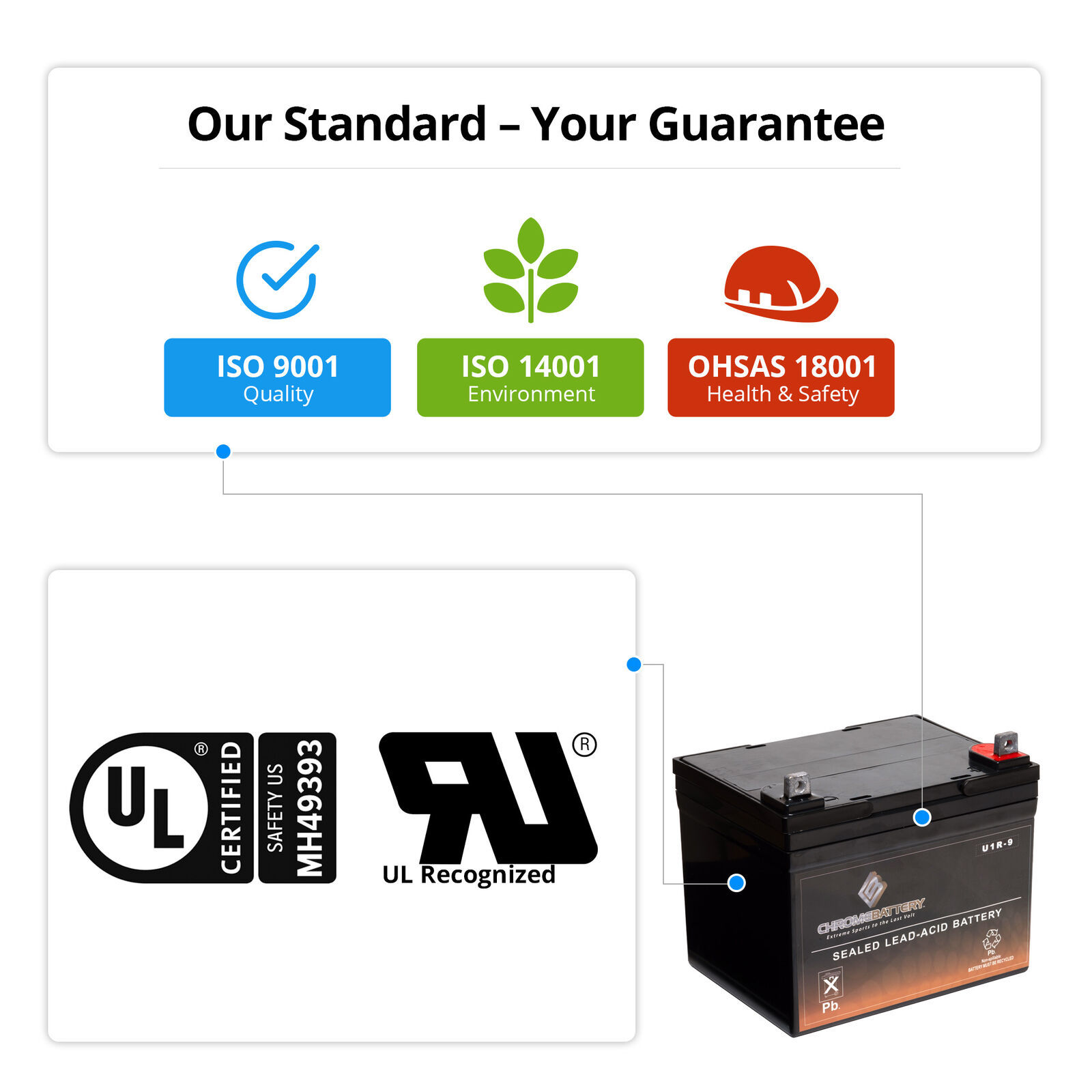 All 12V 35Ah Chrome Battery brand SLA batteries are manufactured with the highest quality materials and rigorously tested to ensure safety, OEM compatibility, effectiveness and optimal performance. Extremely Fast Free Shipping. 60-day no questions asked money-back guarantee. 24-Month warranty.