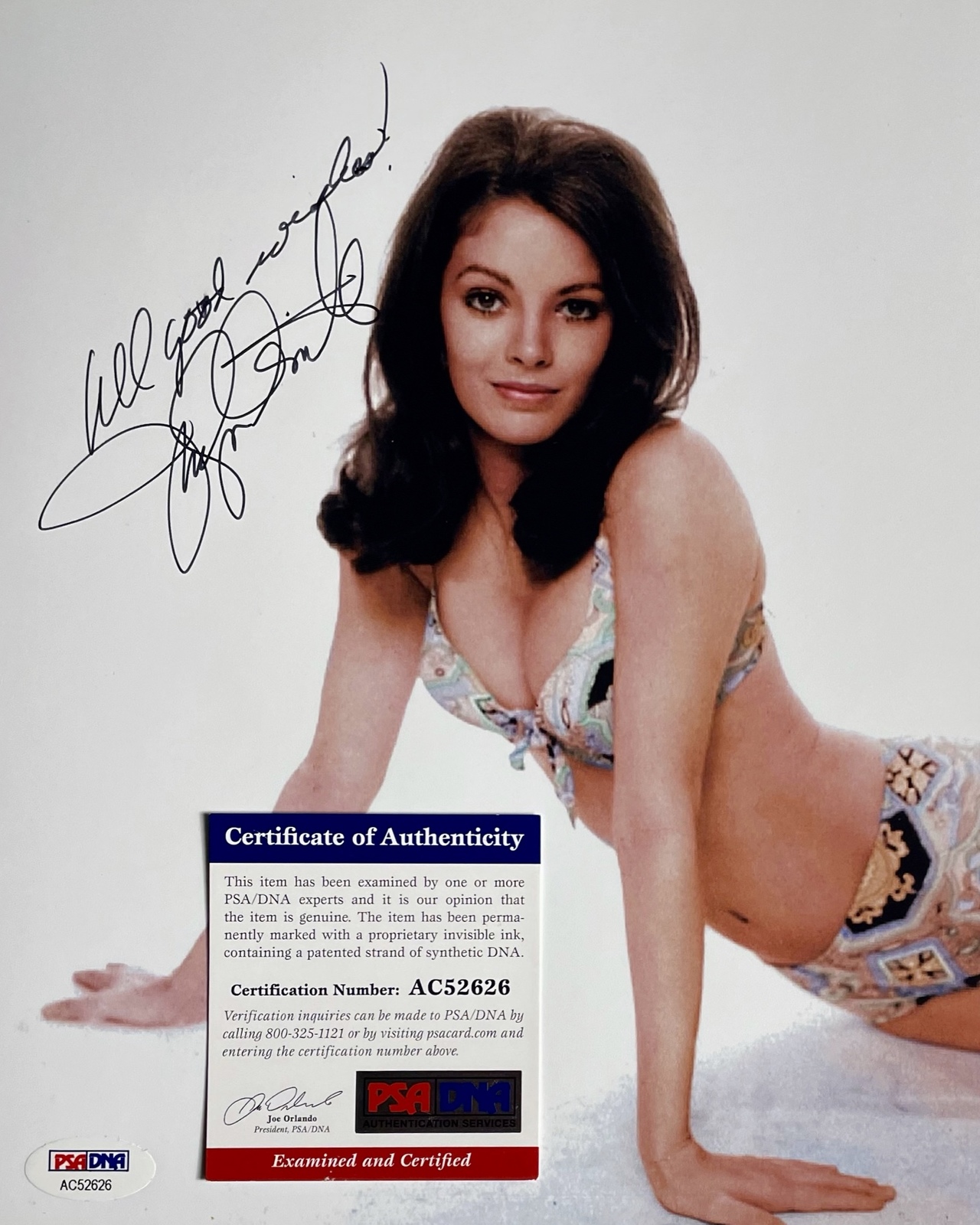 Beautiful Jaclyn Smith autographed 8” x 10” photo hand signed in fine black ink and inscribed All good wishes Jaclyn Smith. This signature has been authenticated by PSA/DNA authentication Certification Number: AC52626 and will come with the matching cert card you see in the scans. Jaclyn Smith is an American actress and businesswoman. She is known for her role as Kelly Garrett in the TV show Charlie’s Angels. Also known for The Adventurers (1970), The Bourne Identity (1988), Nightkill (1980), and others. This photo will come in a clear hard top load for display. Buy with confidence we have been selling autographs since 1992. TV Shows, Hollywood