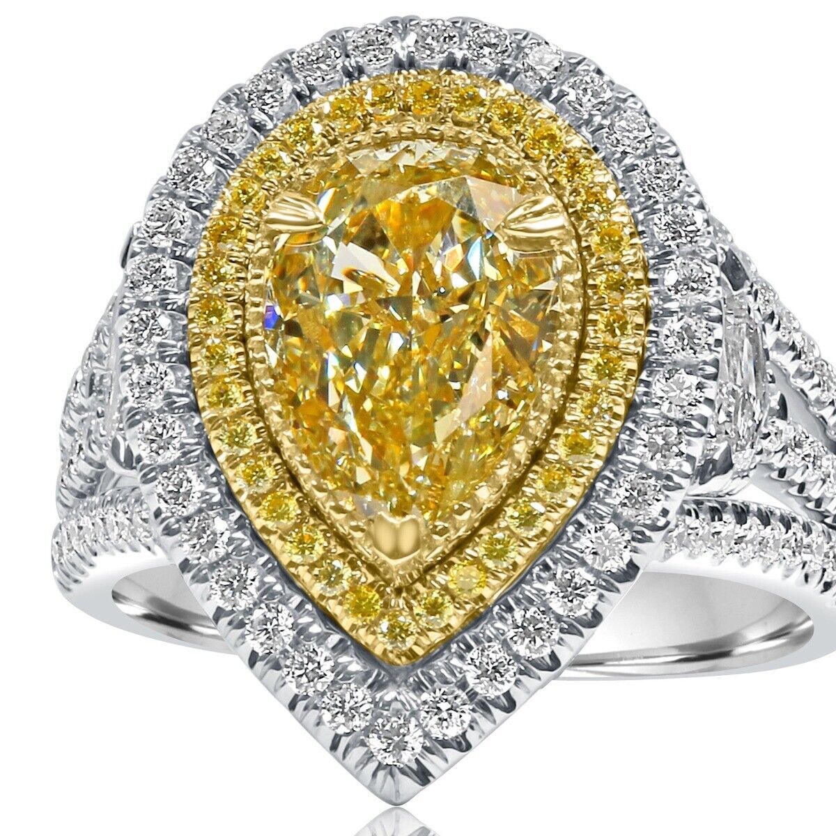 L O V E Forever...Three row diamond engagement ring showcases a 2.08 carat pear brilliant cut natural fancy light yellow diamond surrounded by a double halo of yellow and colorless round brilliants in micro pave setting. The split shank with cadillac cut diamonds adds sparkle and fire at every angle. Handcrafted in 18-karat two-tone gold. The total carat weight is 3.44 carats.