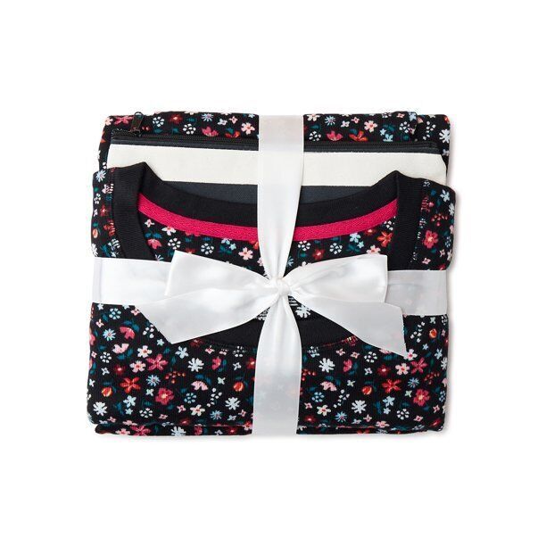 Give the gift of comfort and style this Mother?s Day with this charming 3-piece giftable PJ set from Secret Treasures! This versatile set features a short sleeve dolman style top with a kangaroo pocket that is adorned by self-fabric details. The pull-on elastic waistband jogger is in matching prints with a coordinating makeup bag to carry all your essentials. The set is made from a polyester blend and super brushed jersey for a wonderfully soft feel.