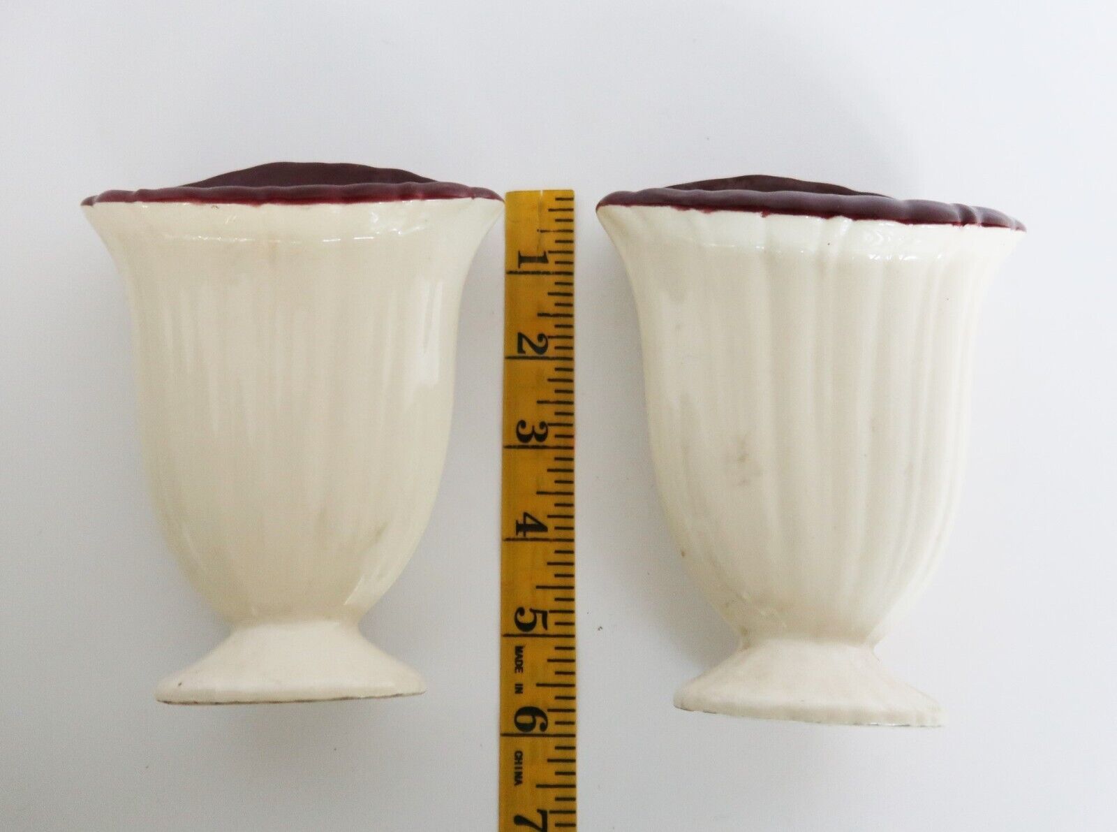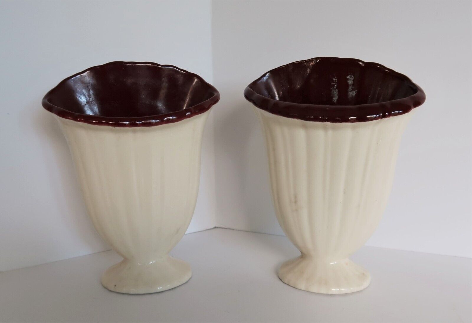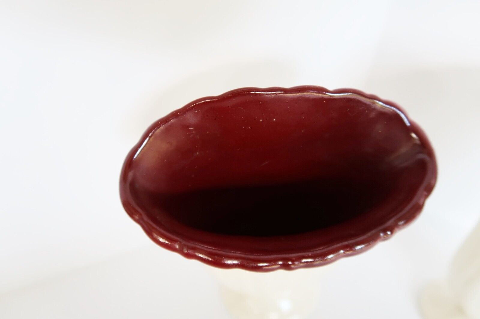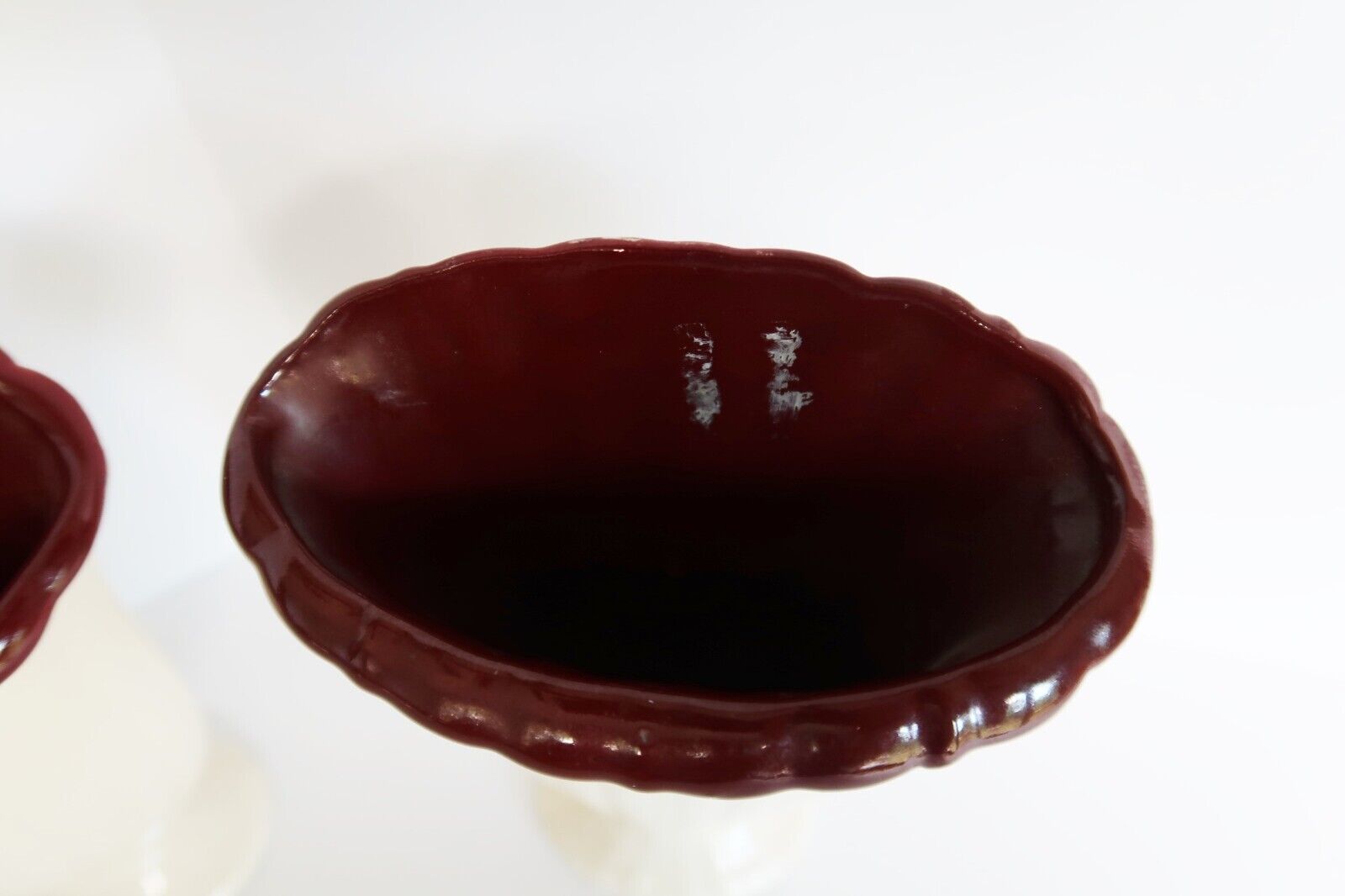 Vtg pair of ceramic Czechoslovakia cream & burgundy glaze pedestal fan vases