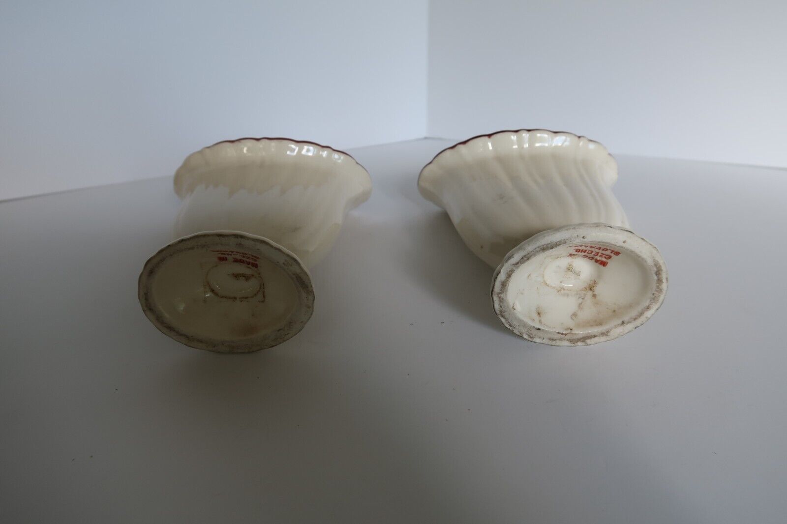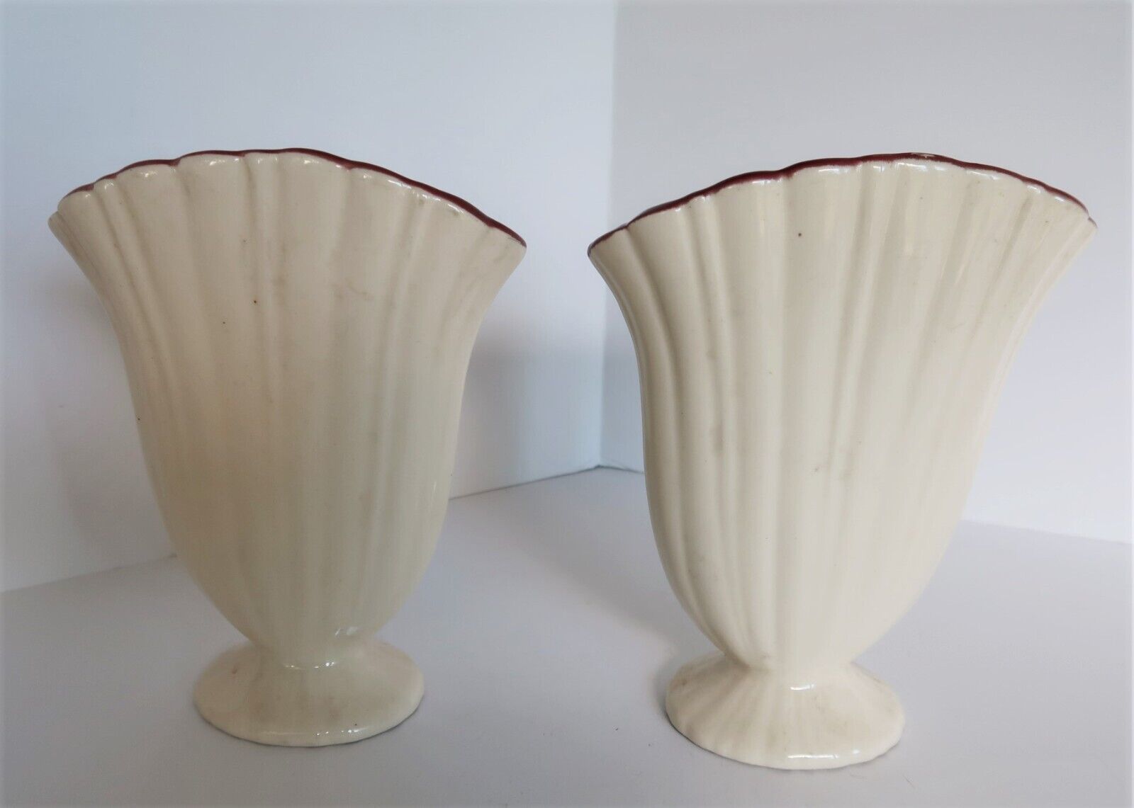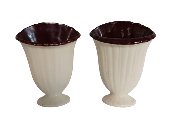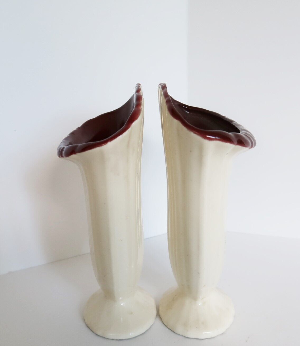 Vtg pair of ceramic Czechoslovakia cream & burgundy glaze pedestal fan vases