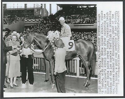 This is a captioned, 10" x 8" Black White photo of ROUGH 'N TUMBLE after winning the Santa Anita Derby. This photo was printed on a top quality photographic paper and is in MINT Condition. FREE packaging and First Class Postage shipping in the U.S.A. International Postage cost will be determined by the Country of the Buyer. If you buy more than one item please pay for all the items with one combined PayPal payment rather than paying for each item individually. If you would like this photo printed in a larger size I can offer a